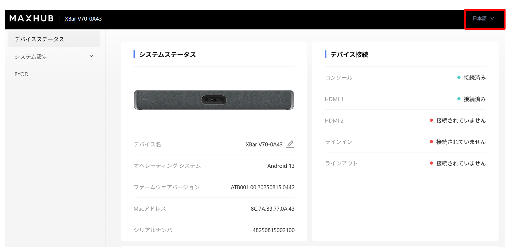 BYODモードの有効化は同一ネットワーク上の端末のWebブラウザから行います。