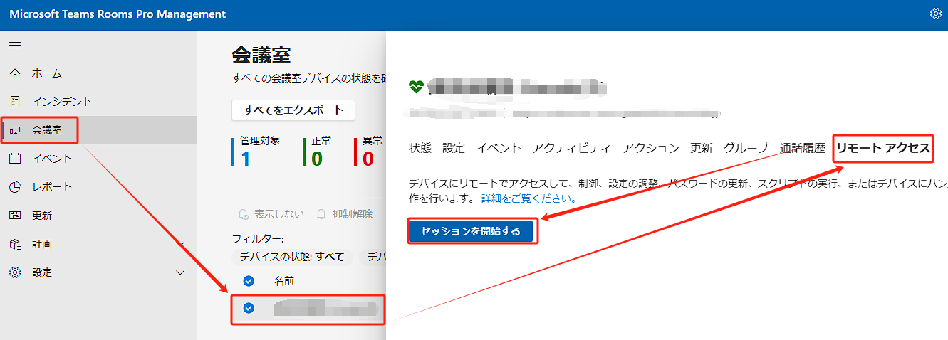 Microsoft Teams Rooms Pro ライセンスを構成したデバイスは、Microsoft Teams Rooms Pro Management ポータルからリモートアクセスができます。