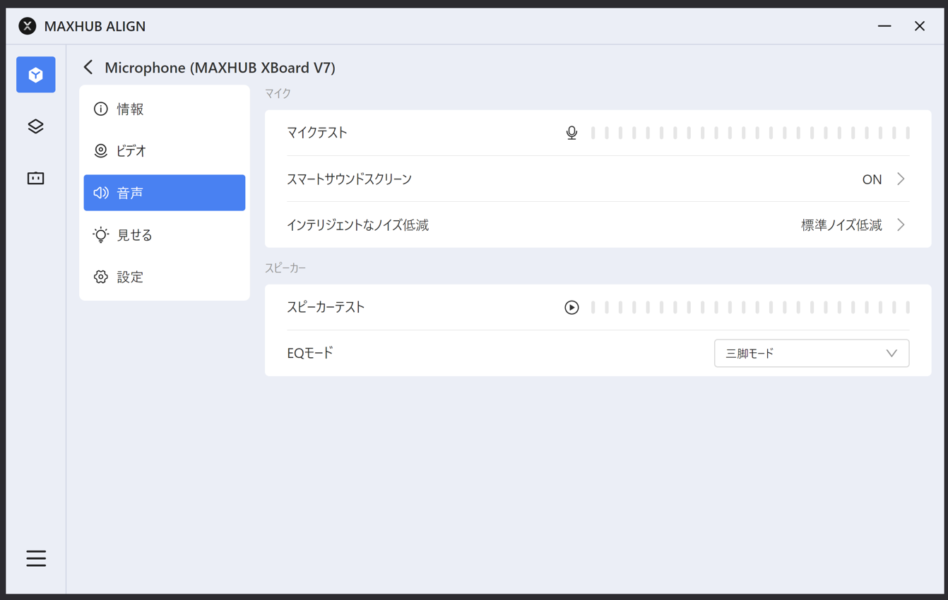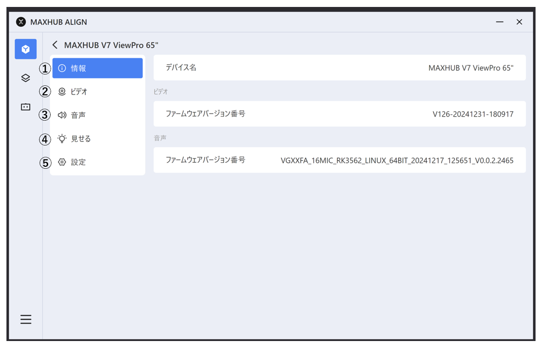 本機のデバイス名やカメラマイクスピーカーのファームウェアバージョンを確認できます。
