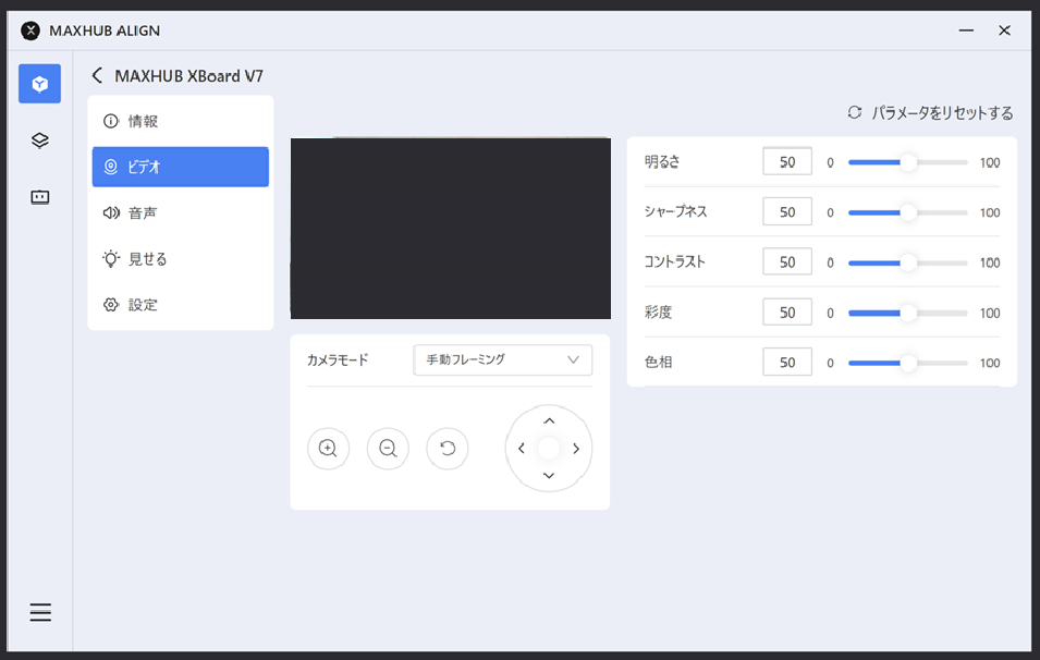 カメラモードの変更、手動フレーミングによる画角調整、カメラのパラメータ設定ができます。