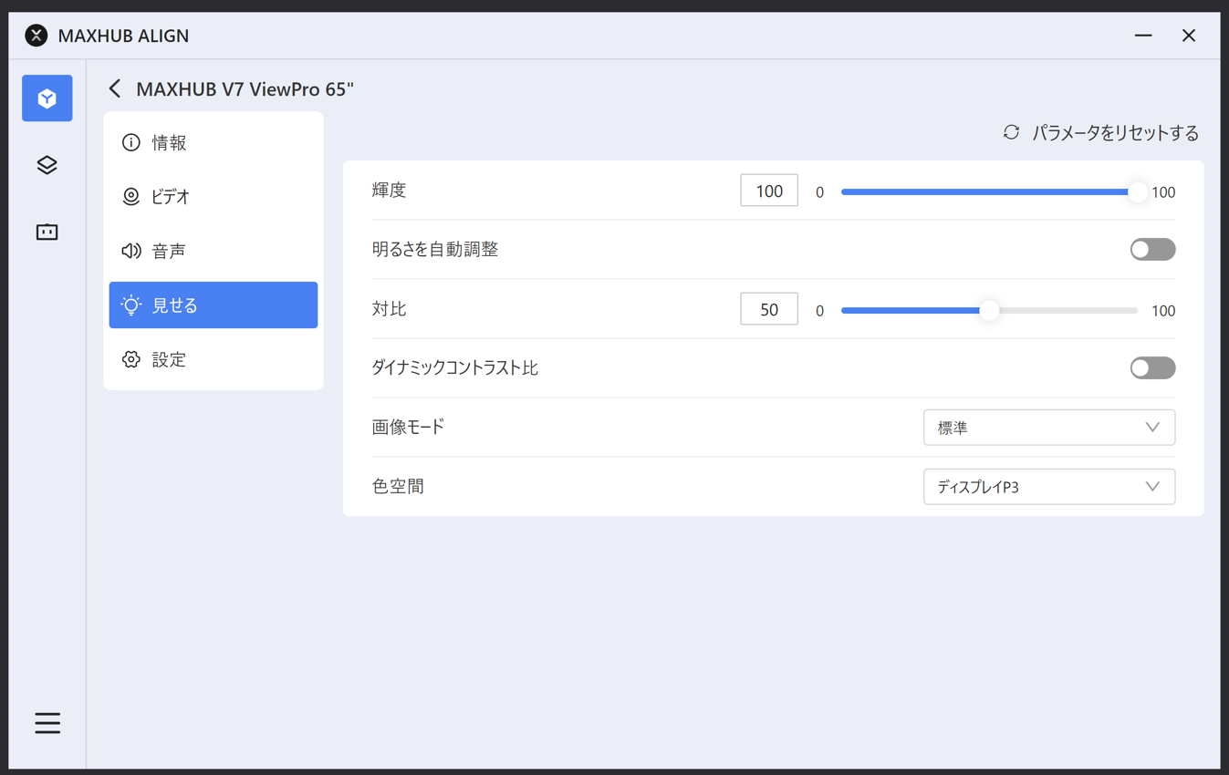 輝度などのパラメータの設定ができます。