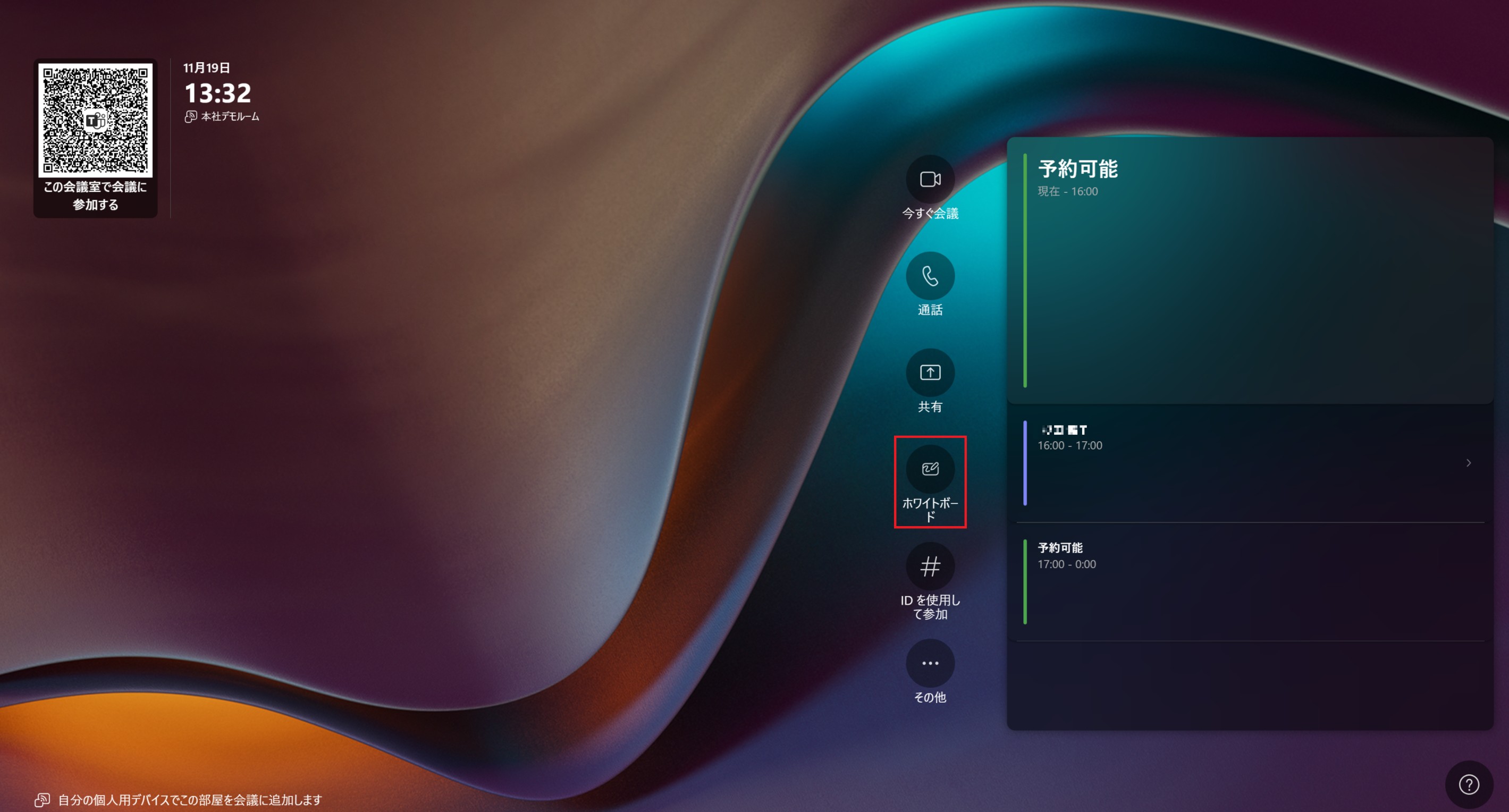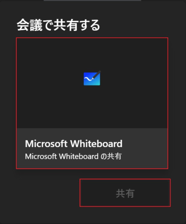Teams会議でホワイトボード共有をする場合右下の共有ボタンを選択2.Microsoft whiteboard→共有を選択Teams会議をせずにホワイトボードを使用する場合ホーム画面のホワイトボードを選択