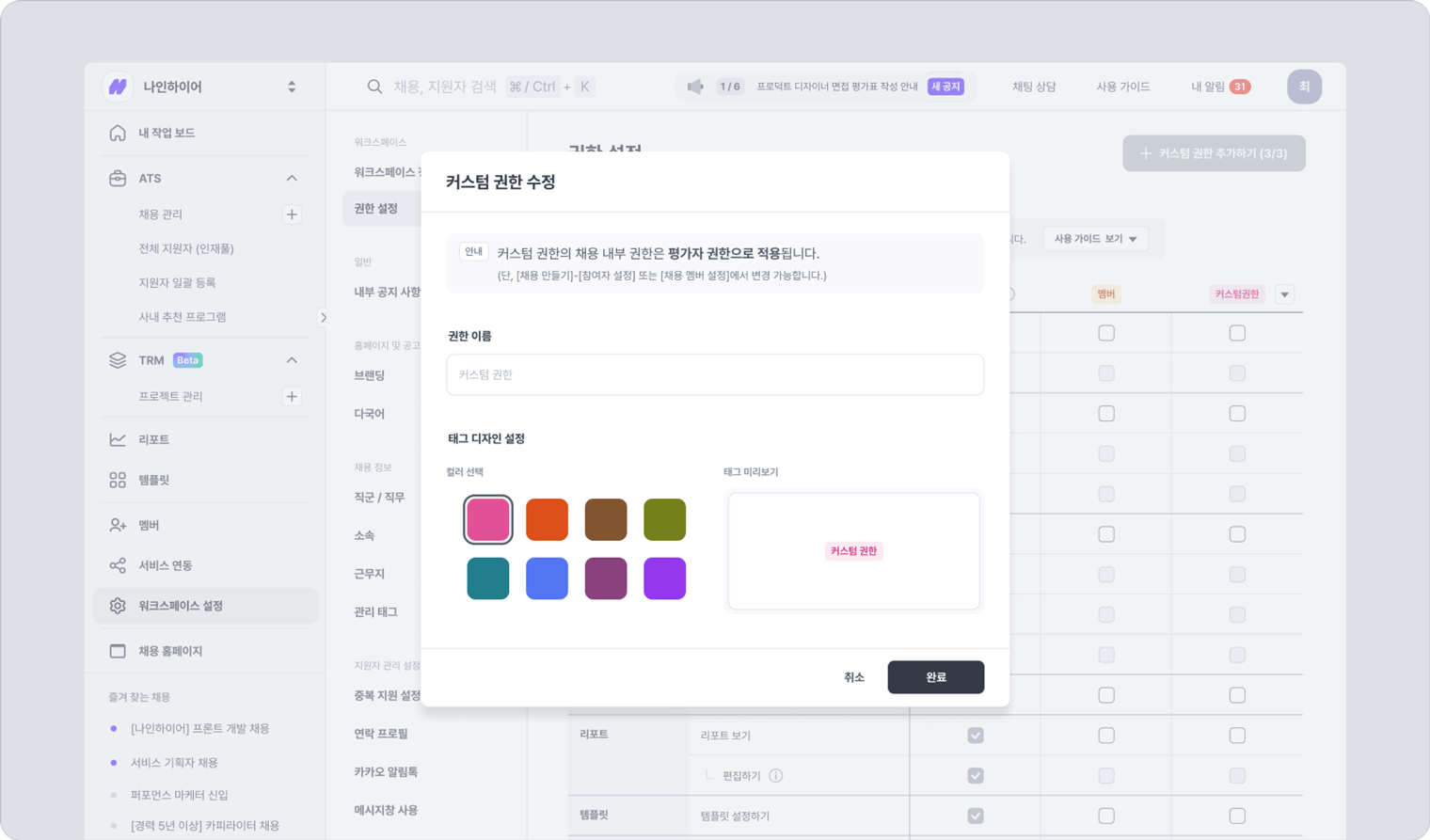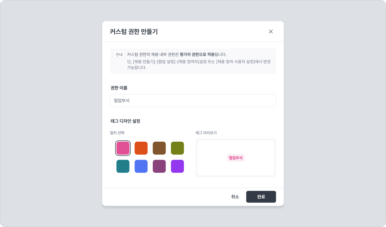 커스텀 권한 만들기 모달이 나타납니다. 권한의 이름, 컬러를 설정하고 [완료]를 클릭합니다.