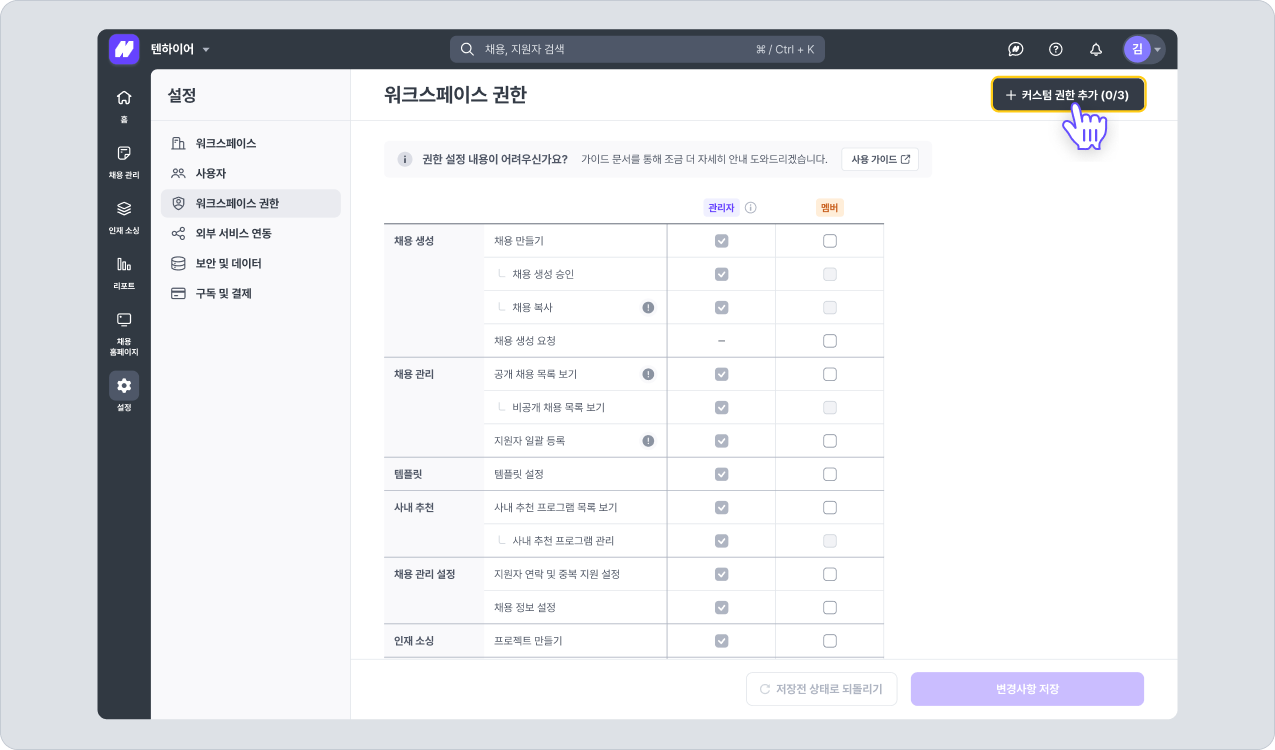 설정 > 워크스페이스 권한에서 오른쪽 상단의 [커스텀 권한 추가]를 클릭합니다.