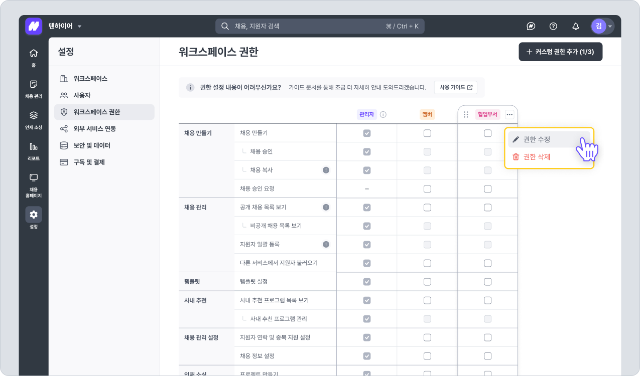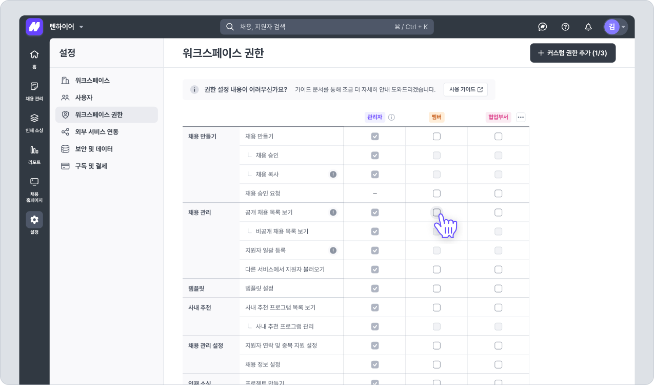 워크스페이스 관리자는 [멤버], [커스텀] 권한의 허용 범위를 항목 별로 설정할 수 있습니다. [관리자] 권한의 설정값은 고정되어 변경이 불가합니다.