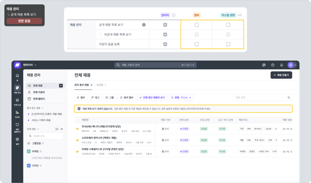 공개 채용 목록 보기의 체크가 해제된 경우, 해당 권한은 모든 채용 및 보관함 리스트에서 자신이 참여 중인 채용만 확인할 수 있게 됩니다.