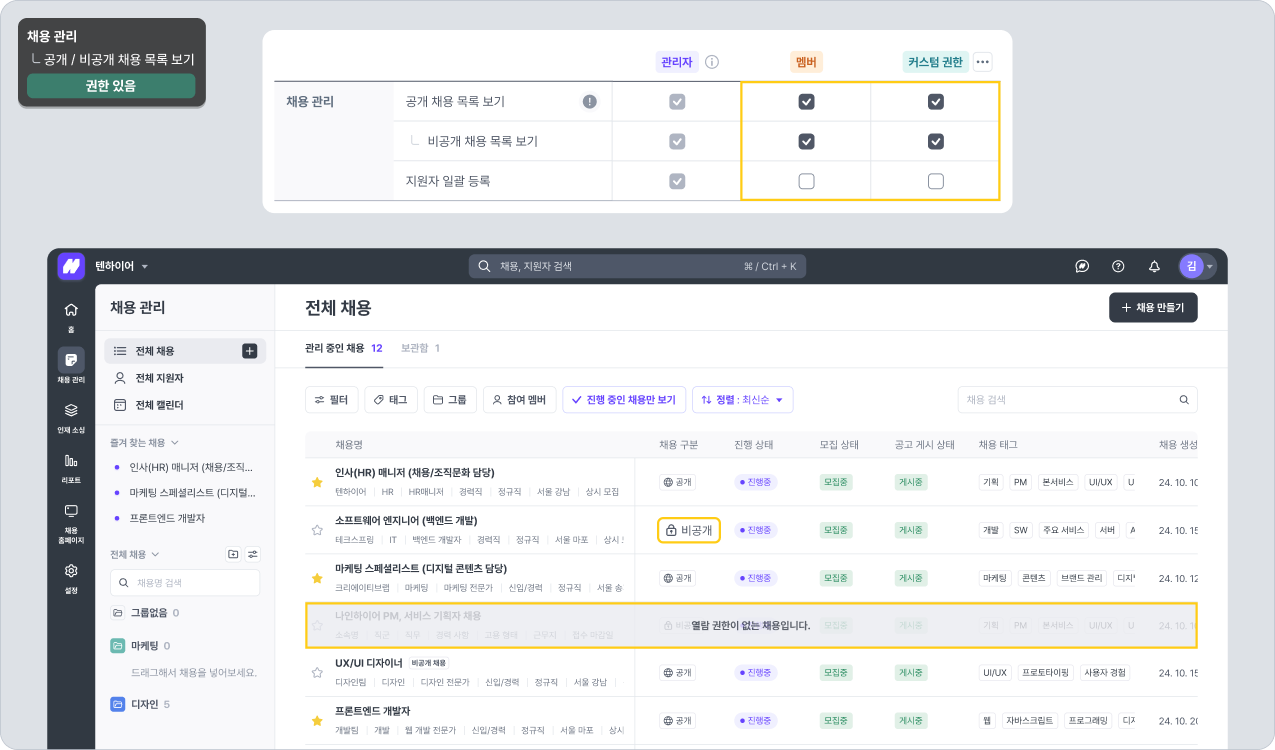 전체 비공개 채용 목록 보기 체크는 신중히 선택해 주세요. 해당 권한이 부여된 이들은 비공개 채용의 존재를 관리자처럼 모두 알 수 있게 됩니다.