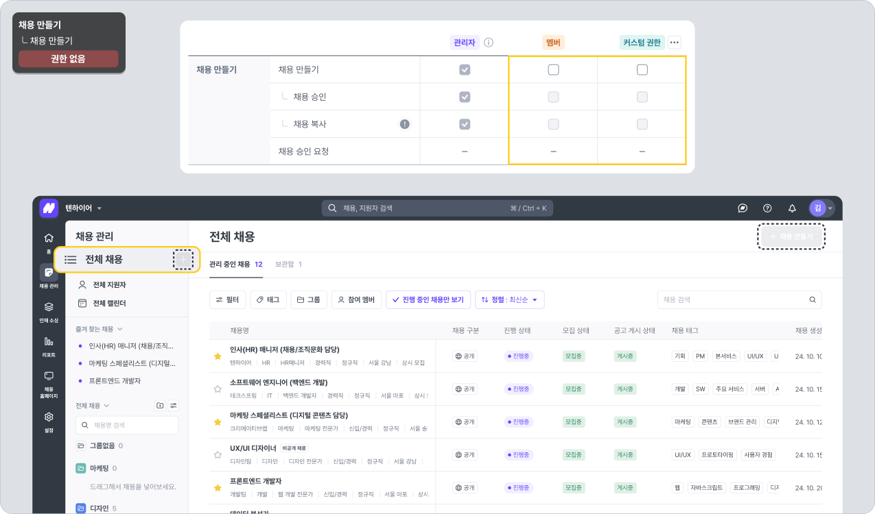 채용을 만들 수 없는 권한인 경우, 채용 관리 탭에 "채용 만들기" 버튼이 표시되지 않습니다.