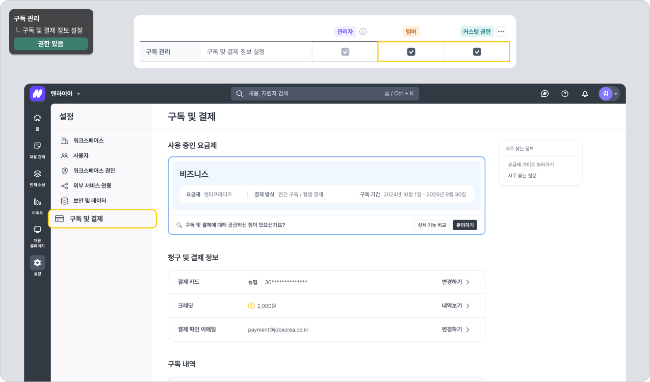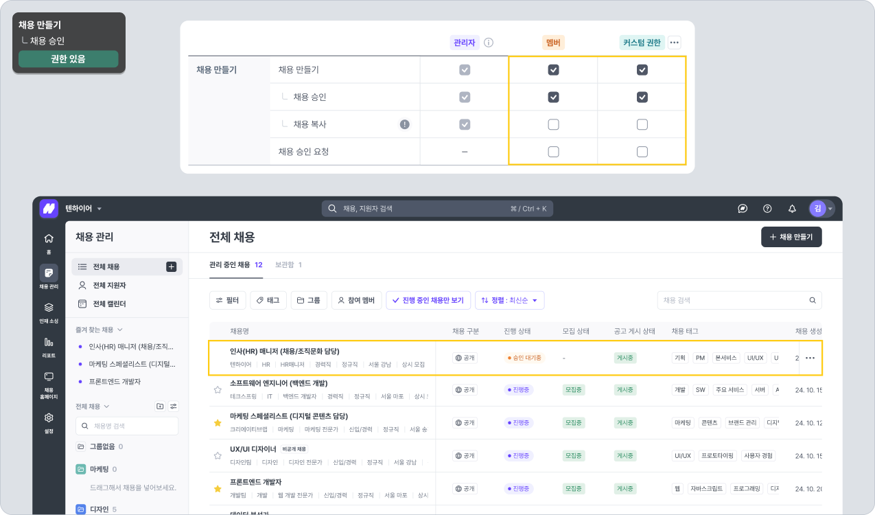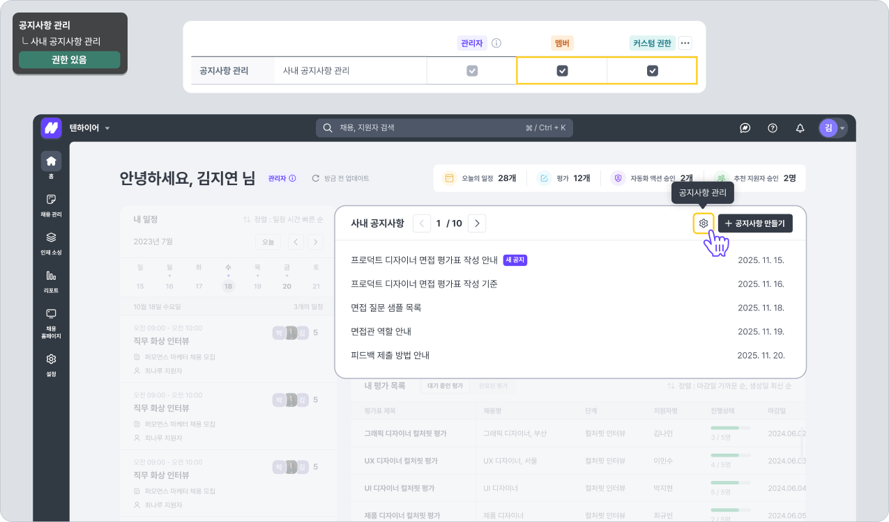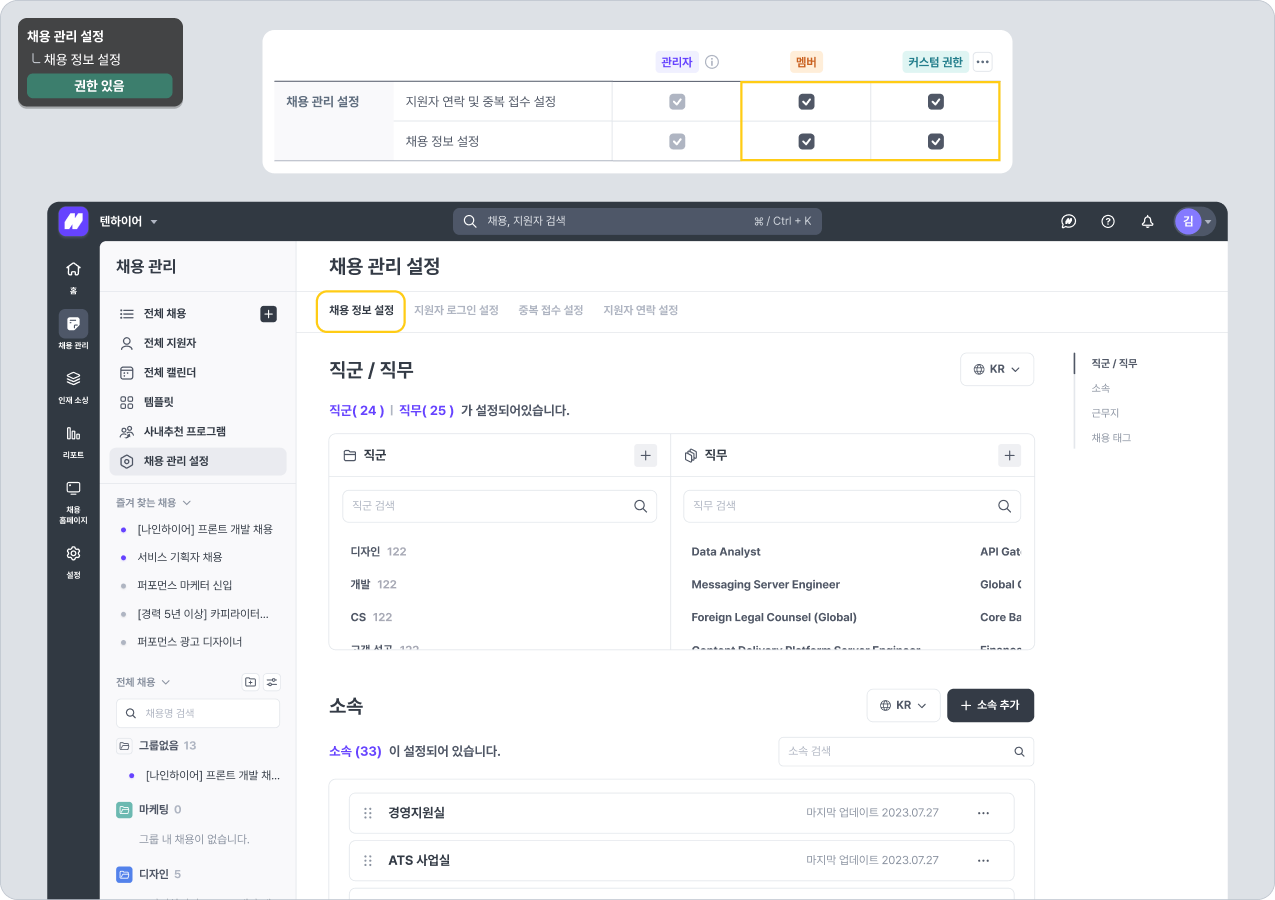 • 상위 항목이 체크되어야 하위 항목 설정이 가능합니다. (예를 들어, “채용 만들기” 항목이 체크되어 있어야 하위 항목인 “채용 승인하기” 항목이 활성화되어 체크가 가능합니다.)