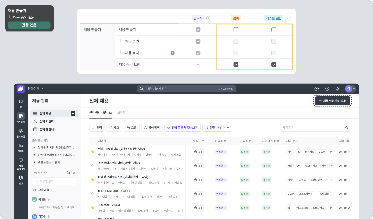 단, "채용 생성 승인 요청" 권한을 부여하면, "채용 생성 승인 요청" 버튼이 표시됩니다. 채용을 직접 만들 수는 없고, 승인을 요청하여 승인되어야 채용이 생성됩니다. (아래에 해당 옵션에 대한 설명이 이어집니다.)