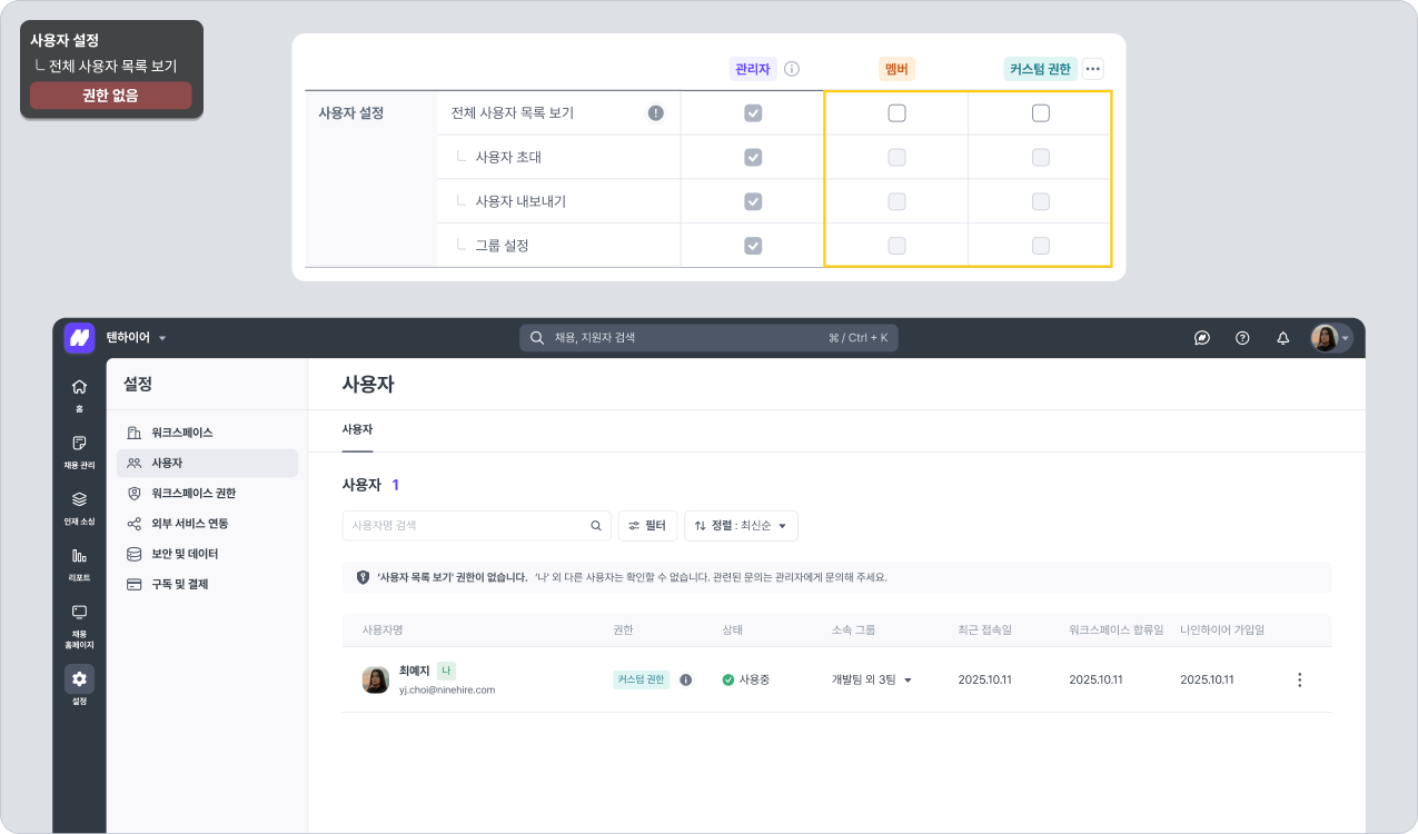 [멤버] 권한과 [커스텀] 권한의 경우 아래와 같은 설정이 가능합니다.