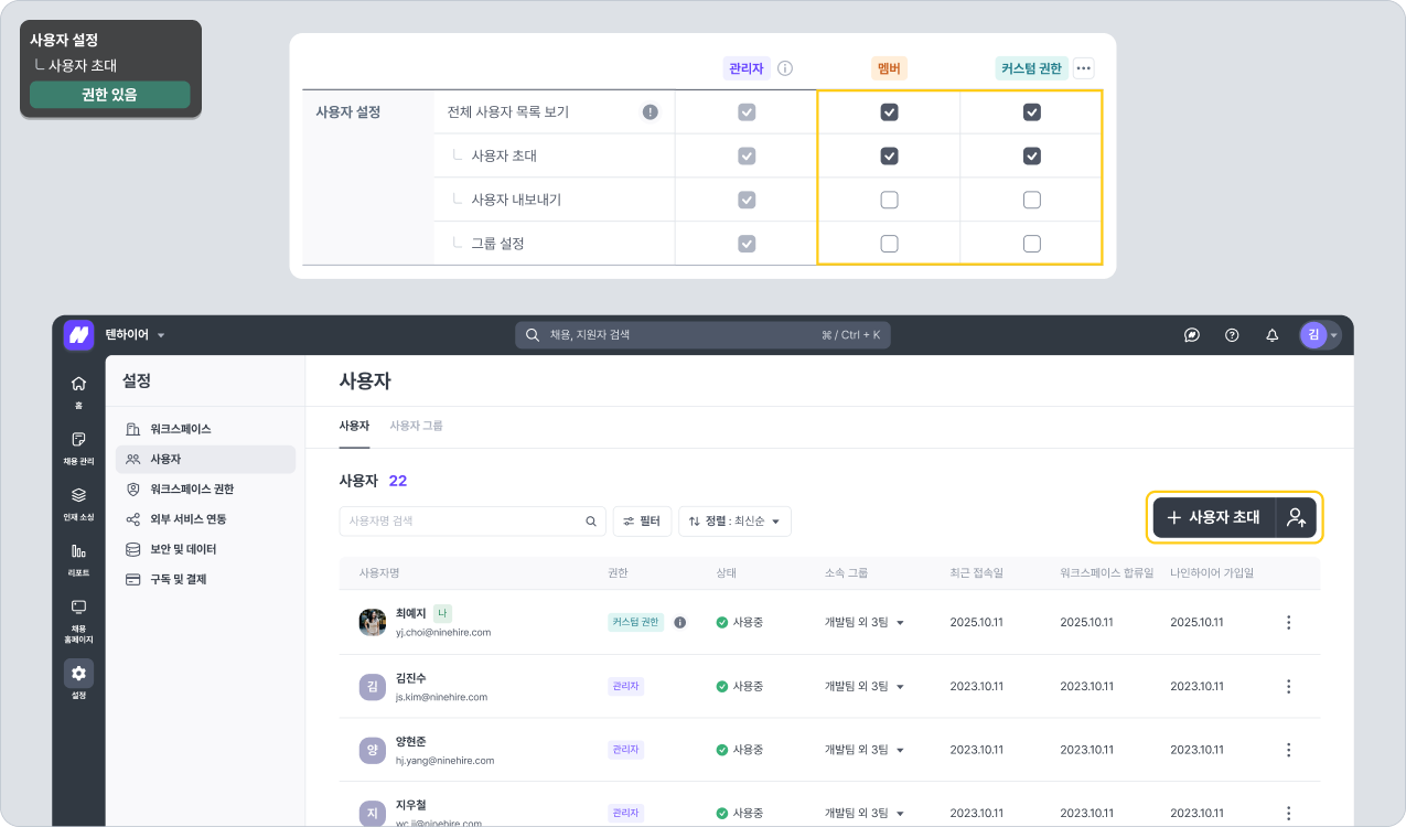 사용자 초대하기 권한이 체크되어 있다면, 사용자 탭 우측 상단에서 "+사용자 초대하기" 버튼을 활용할 수 있습니다.