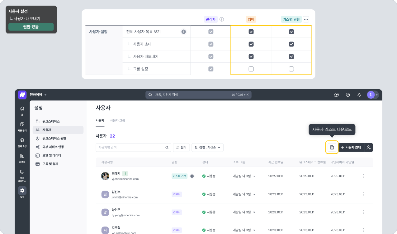 사용자 목록 내보내기 권한이 체크되어 있다면, 사용자 탭 우측 상단에서 "사용자 리스트 다운로드" 버튼이 표시됩니다.