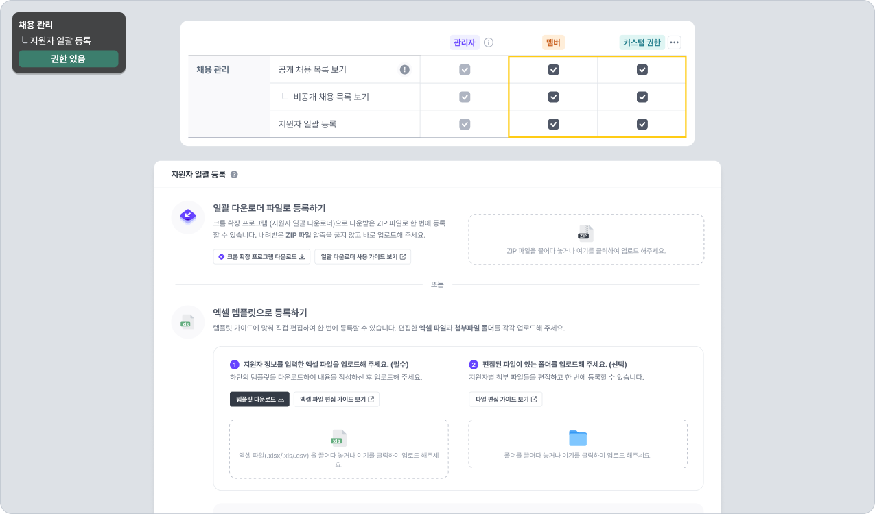 채용 관리 기능 중 "지원자 일괄 등록" 기능 사용 가능 여부를 설정할 수 있습니다.