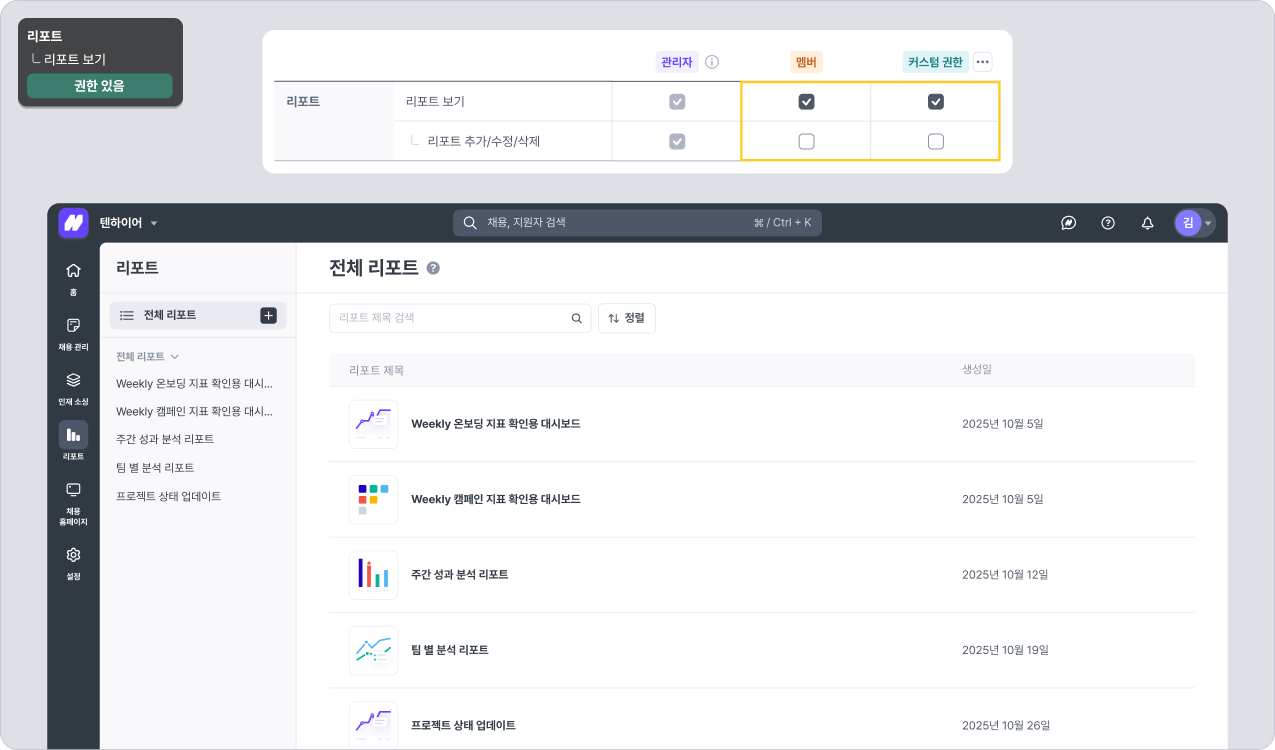 워크스페이스 운영에 필요한 커스텀 권한을 만들어 추가하고, 알맞은 접근/사용 범위를 설정해 보세요. 또한, 멤버 권한의 접근/사용 범위를 조정할 수도 있어요.
