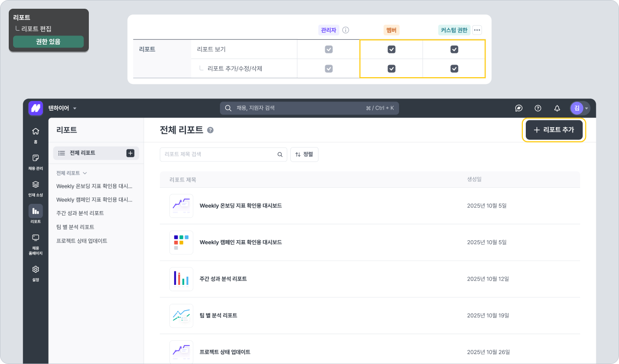 리포트 편집 기능이 부여되면, "리포트 추가" 버튼이 표시되며 리포트를 추가할 수 있게 됩니다.