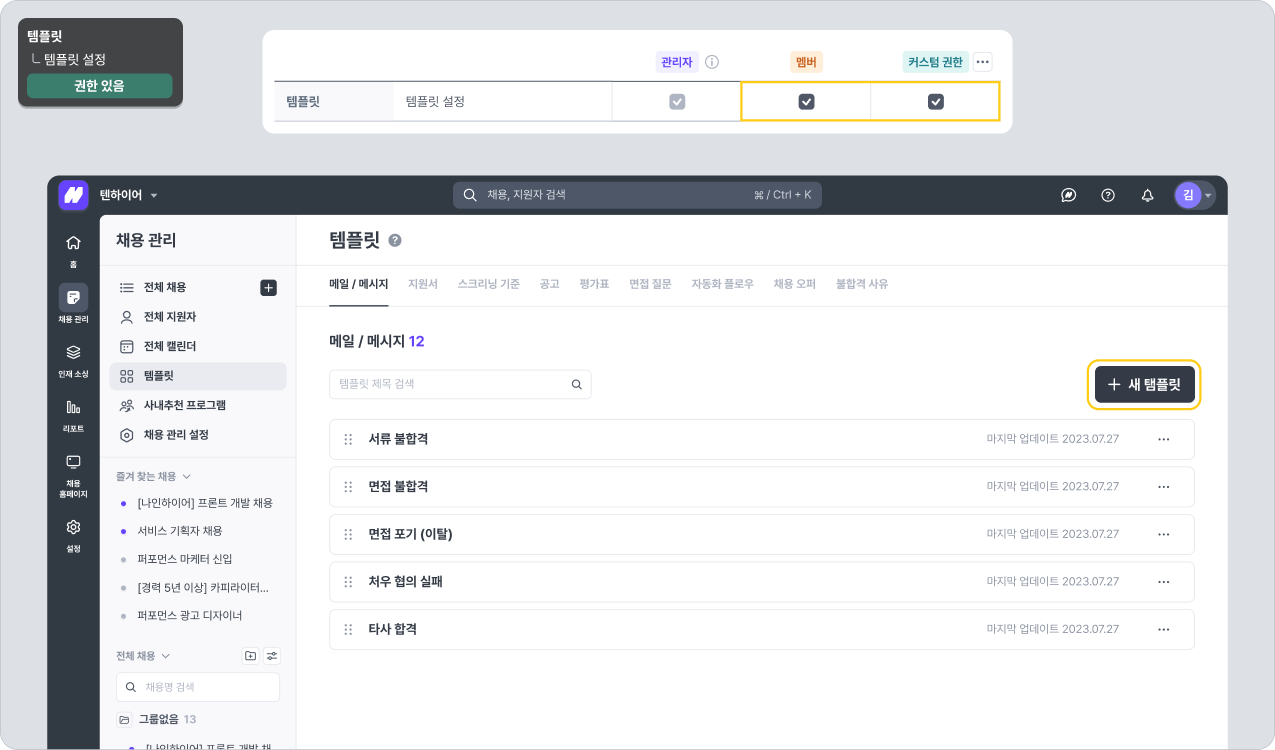 템플릿 설정이이 체크된 경우, 왼쪽 메뉴에 "템플릿" 버튼이 표시되며 페이지 접근이 가능해집니다. 또한, 메시지부터 불합격 사유까지 모든 템플릿의 편집이 가능해집니다.