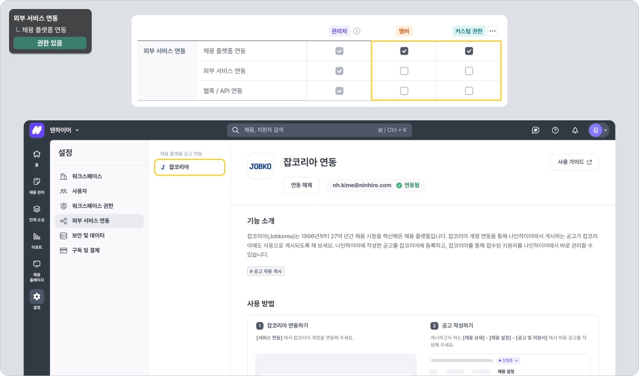채용 플랫폼 연동, 외부 서비스 연동, 웹훅/API 연동 등에 대한 탭 접근 및 기능 활용 권한을 설정할 수 있습니다.