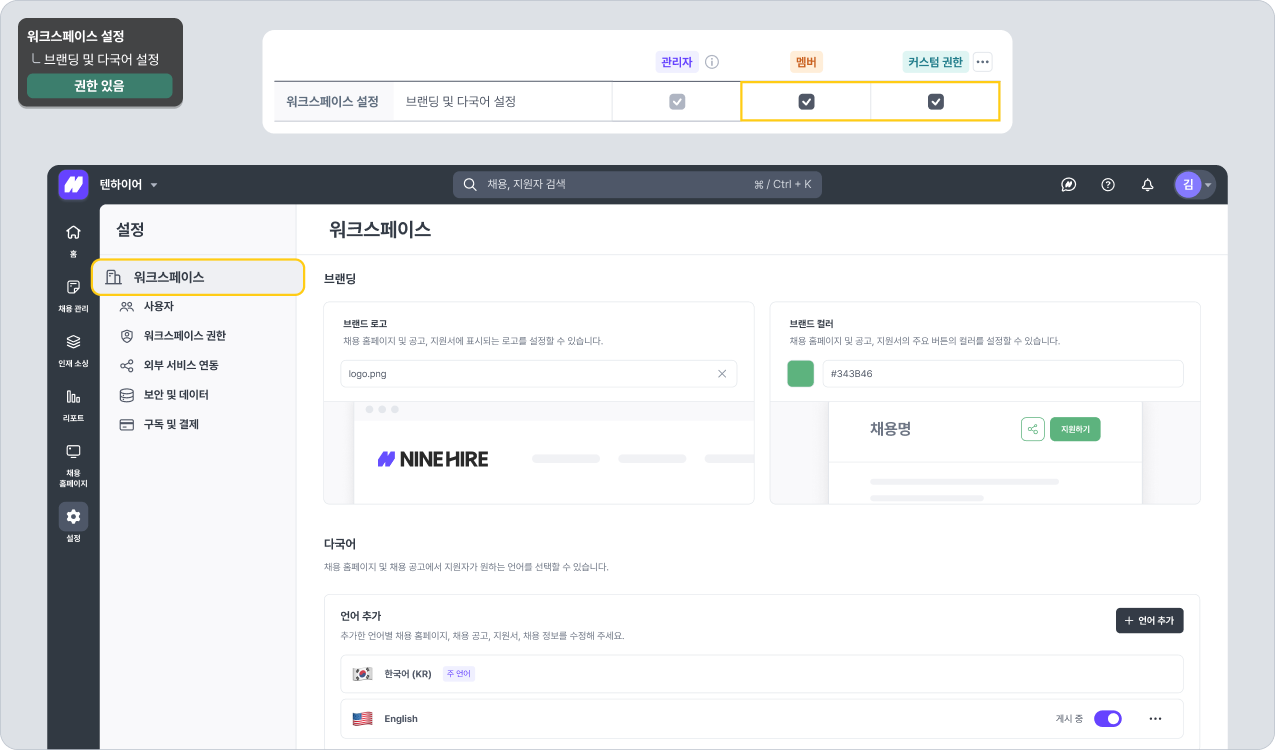 채용 홈페이지, 공고 등에 표시될 브랜드 로고와 컬러 설정, 다국어 설정 등의 기능을 활용할 수 있게 됩니다.