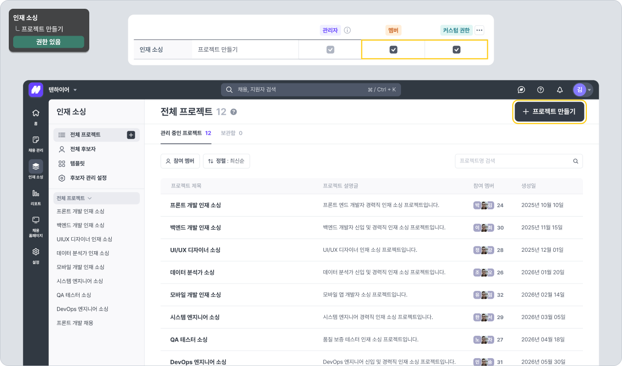 인재 소싱 > 프로젝트 만들기 기능 사용 가능 여부를 설정할 수 있습니다.
