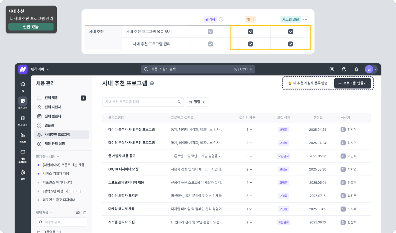 사내 추천 프로그램 관리 권한이 부여되면, 새로운 프로그램을 만들거나 이미 만들어진 프로그램을 수정/관리할 수 있게 됩니다.