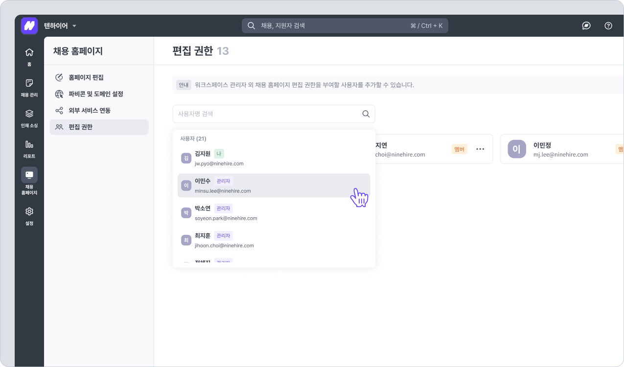 [채용 홈페이지 > 편집 권한]에서 편집 권한을 다른 사용자에게 부여할 수 있습니다.