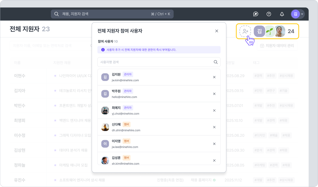 [전체 지원자 > 오른쪽 상단의 참여 사용자 버튼]을 클릭하여 워크스페이스 사용자를 전제 지원자 참여 사용로 설정할 수 있습니다.