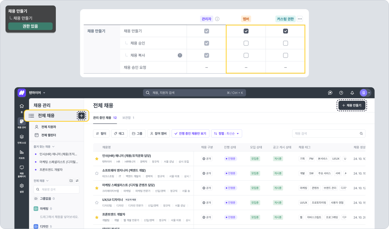 채용 만들기 권한이 부여되면, 채용 관리 탭에 “채용 만들기” 버튼이 표시됩니다. 즉, 채용을 직접 만들 수 있게 됩니다.