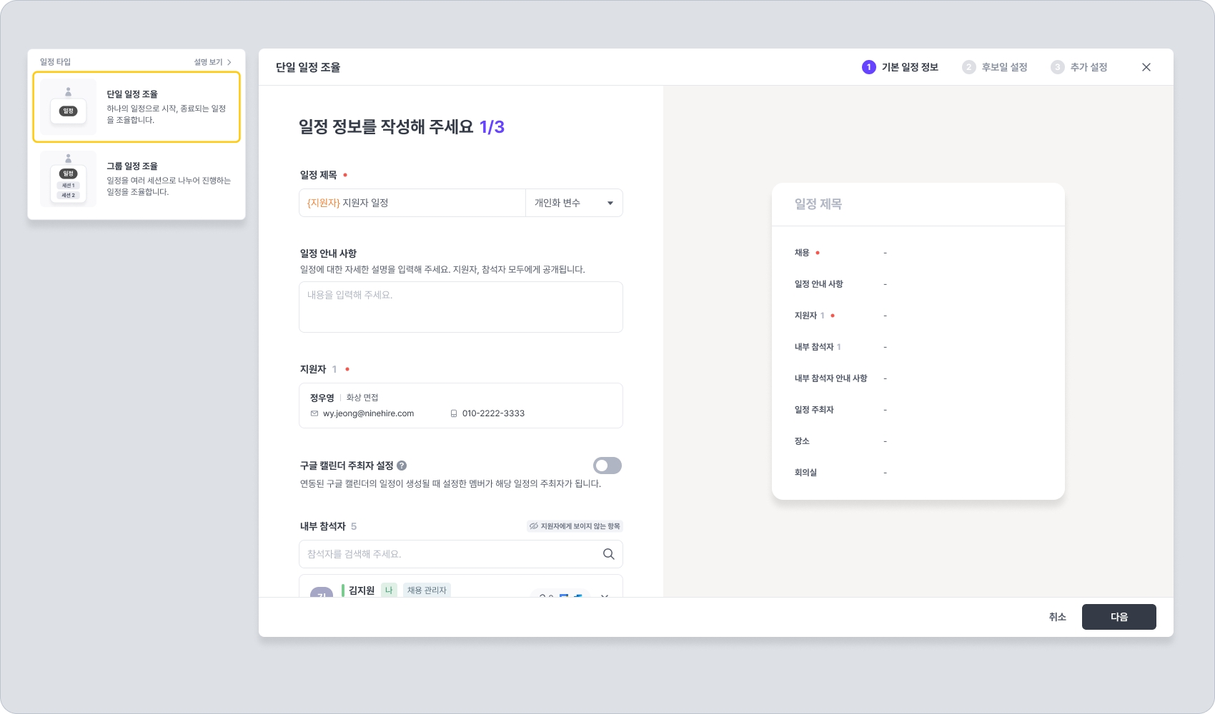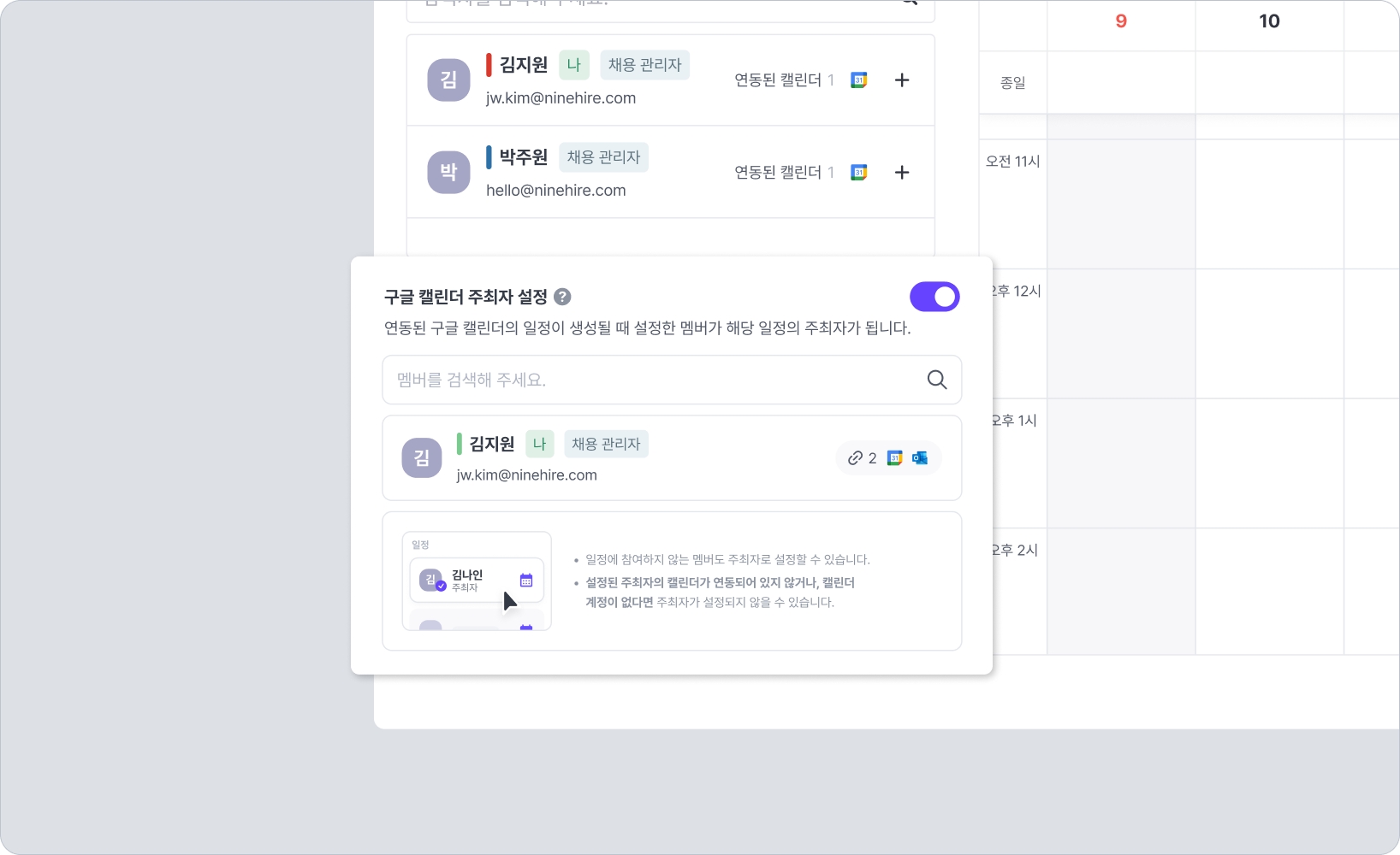 지원자와 일정을 조율하거나 직접 일정을 생성할 때, 구글 캘린더가 연동되어 있다면 나인하이어에서 해당 구글 캘린더로 생성되는 일정의 주최자 설정이 가능합니다.