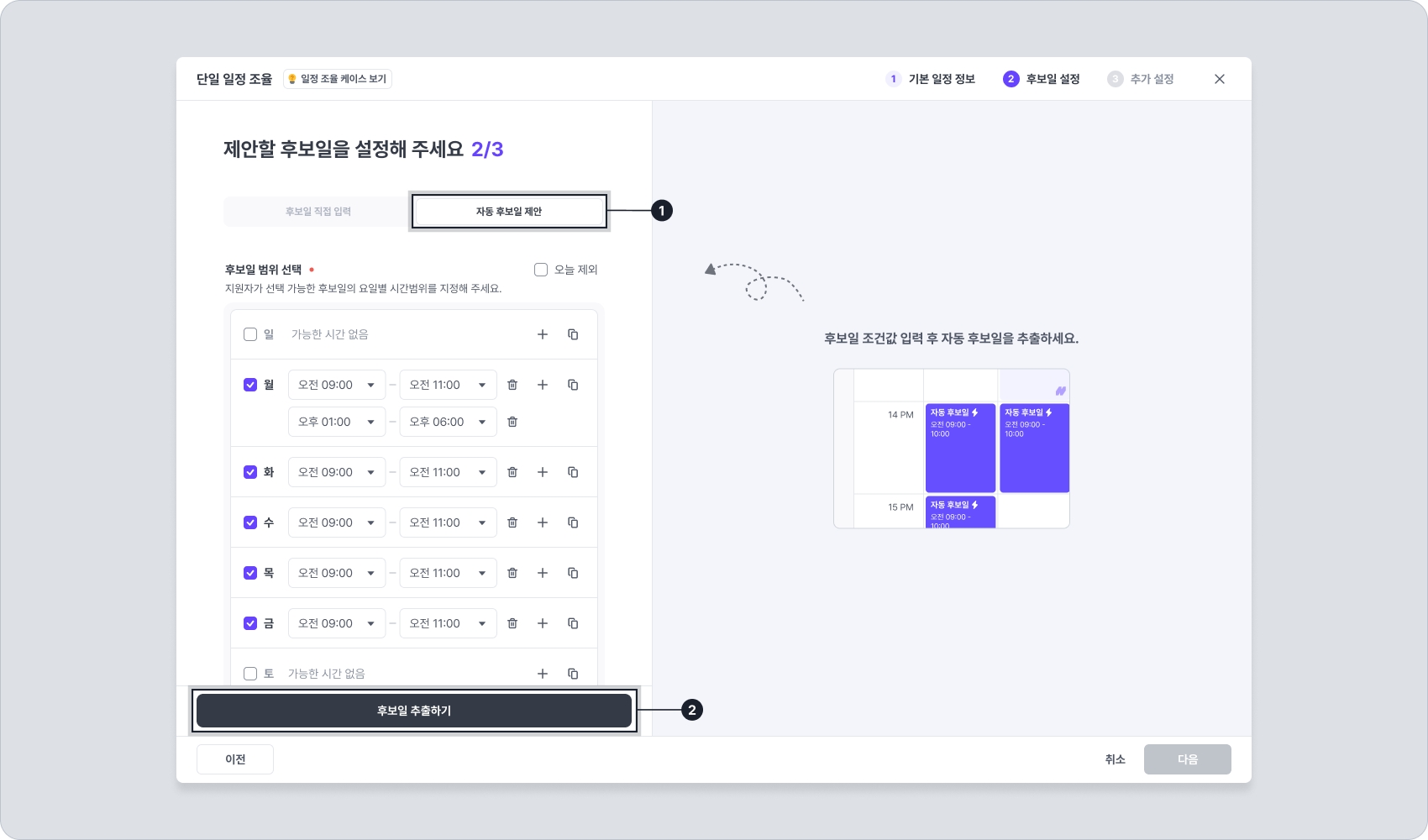 자동 후보일 제안 방식의 조건들을 입력합니다.