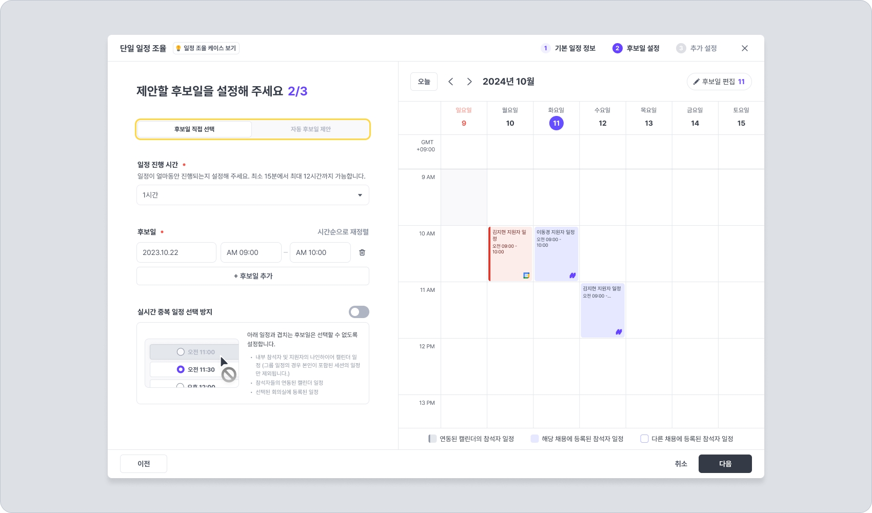 후보일 직접 선택 - 채용 담당자가 직접 후보일을 지정하여 지원자에게 선택을 요청하는 방식입니다. 이 방식은 이미 확정된 일정이나 연동된 외부 캘린더에 일정이 있는 경우에도 후보일로 지정할 수 있으며 지원자가 이 일정을 선택할 수 있습니다. 단, “실시간 중복 일정 선택 방지” 기능을 켜면 참석자 및 회의실 일정과 중복되는 후보일 선택을 제한할 수 있습니다.