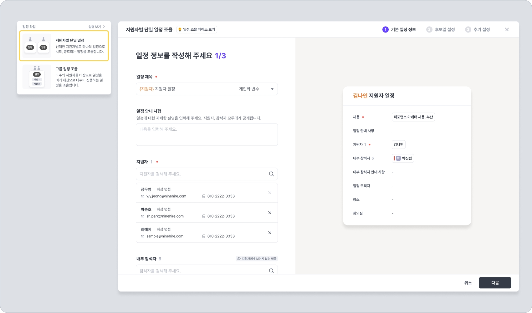 실시간 중복 일정 선택 방지 : 참석자의 외부 캘린더 일정과 나인하이어 일정, 회의실 일정을 고려하여 실시간으로 지원자의 중복 일정 선택을 방지하는 기능을 켤 수 있습니다.