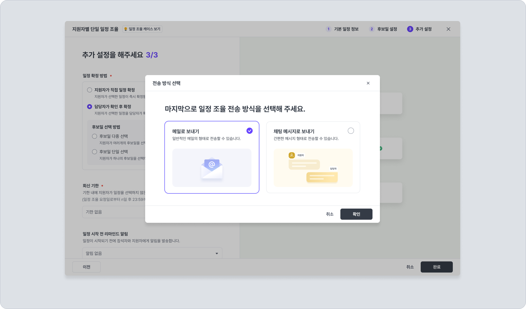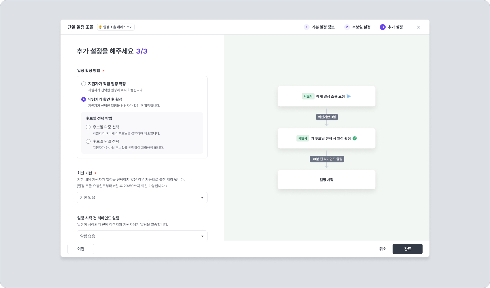 담당자가 확인 후 확정 : 지원자가 후보일을 다중 선택하거나 단일 선택하도록 설정하고, 이를 담당자가 확인하여 확정하는 방식입니다.