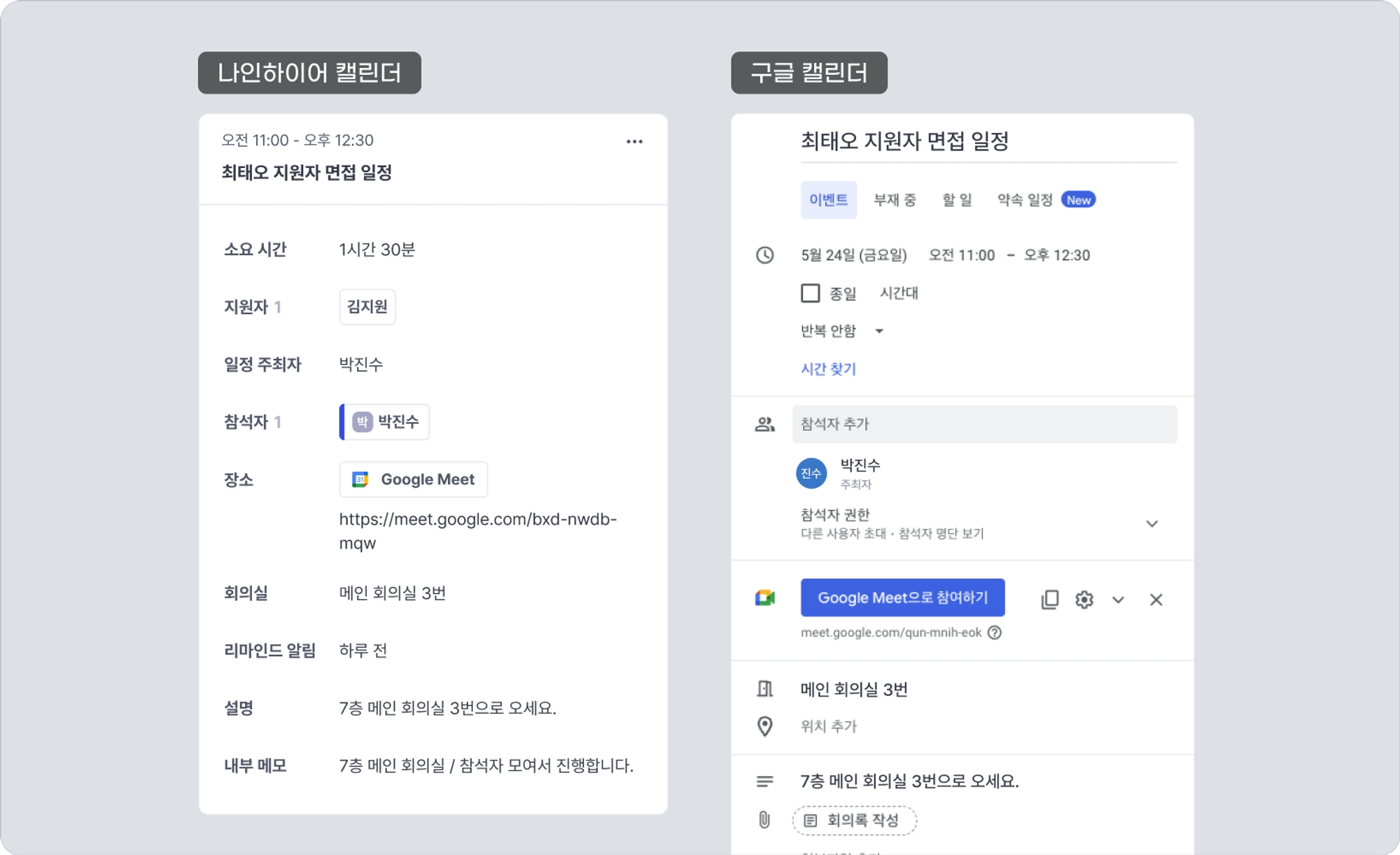 주최자를 지정하면 나인하이어 캘린더 탭과 구글 캘린더 일정에서 누가 주최자인지 확인할 수 있습니다.