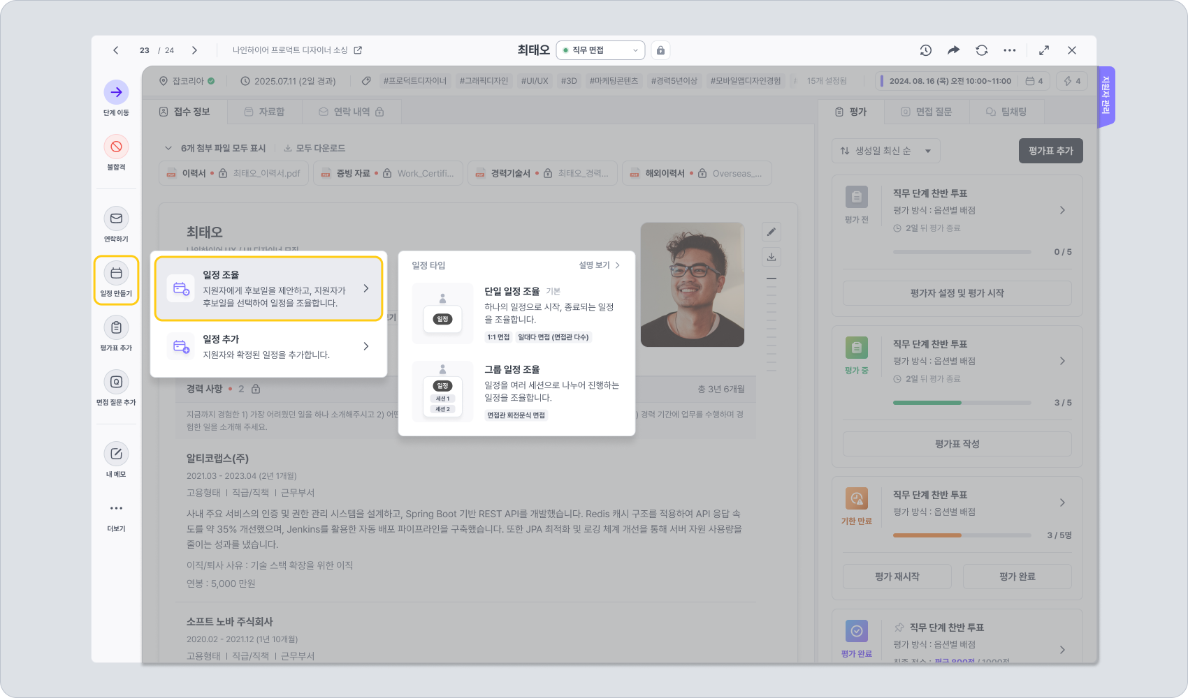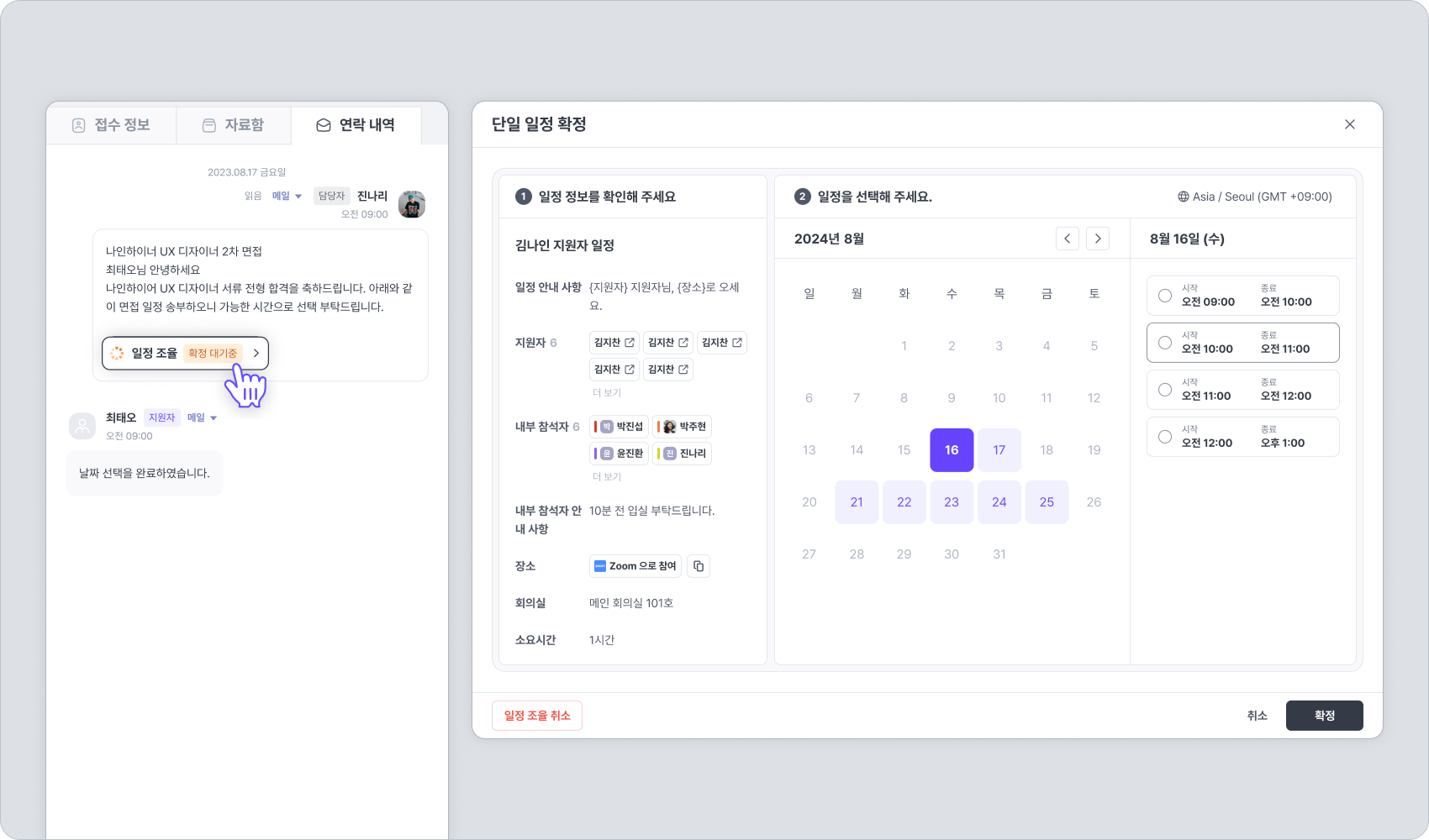경로: 지원자 상세 화면 내에서 일정 조율 > 단일 일정 조율