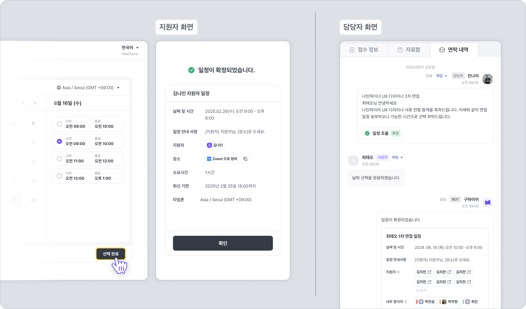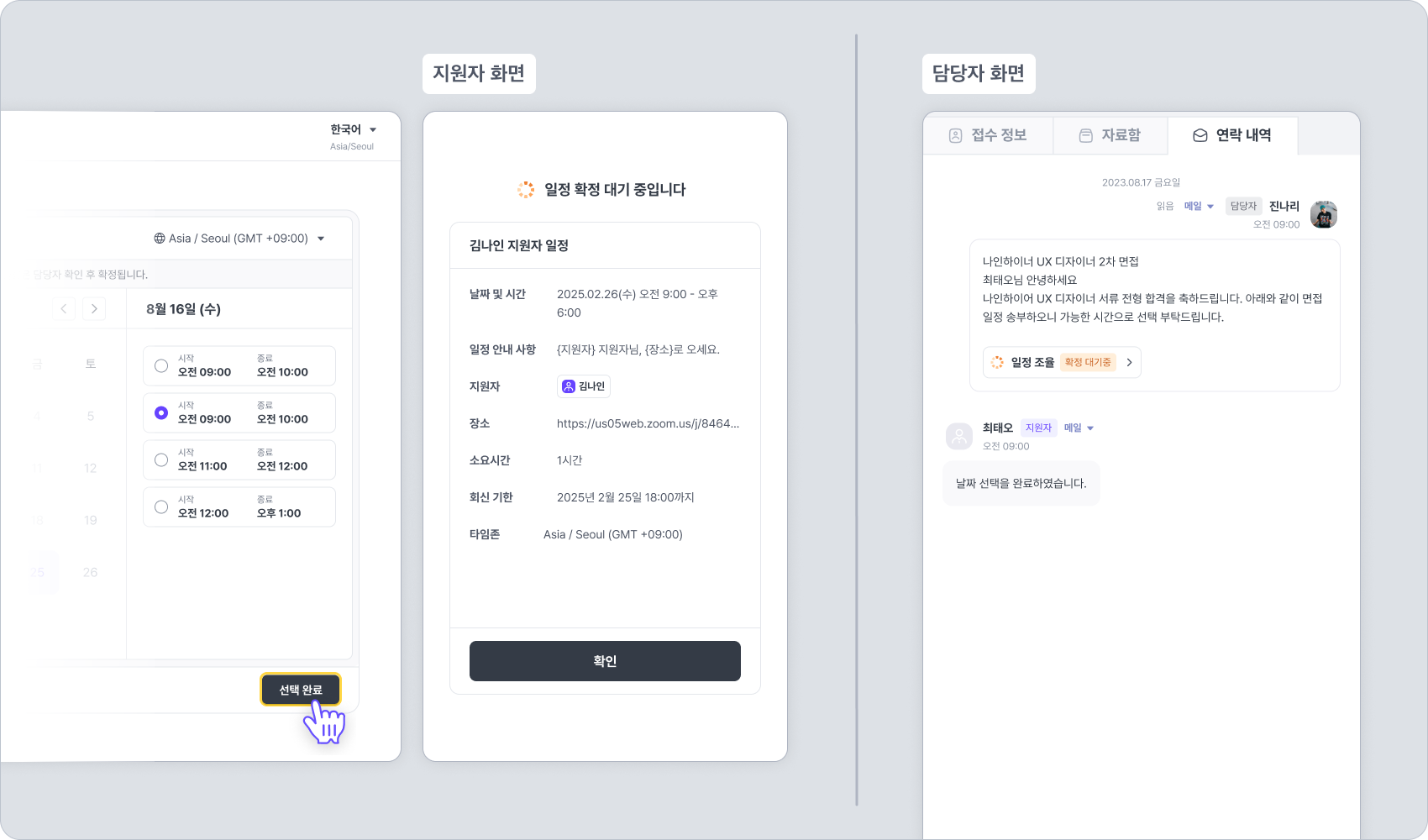 일정 확정 방법을 “담당자가 확인 후 확정”으로 설정한 경우, 지원자가 일정을 선택한 후 담당자의 확정이 필요합니다.
