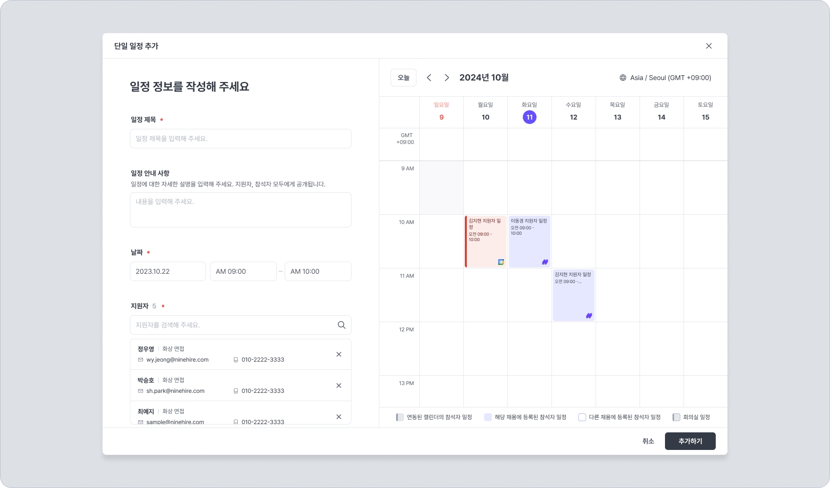 추가 후 알림 발송: 일정을 추가하고 지원자와 내부 참석자에게 알림이 발송됩니다.