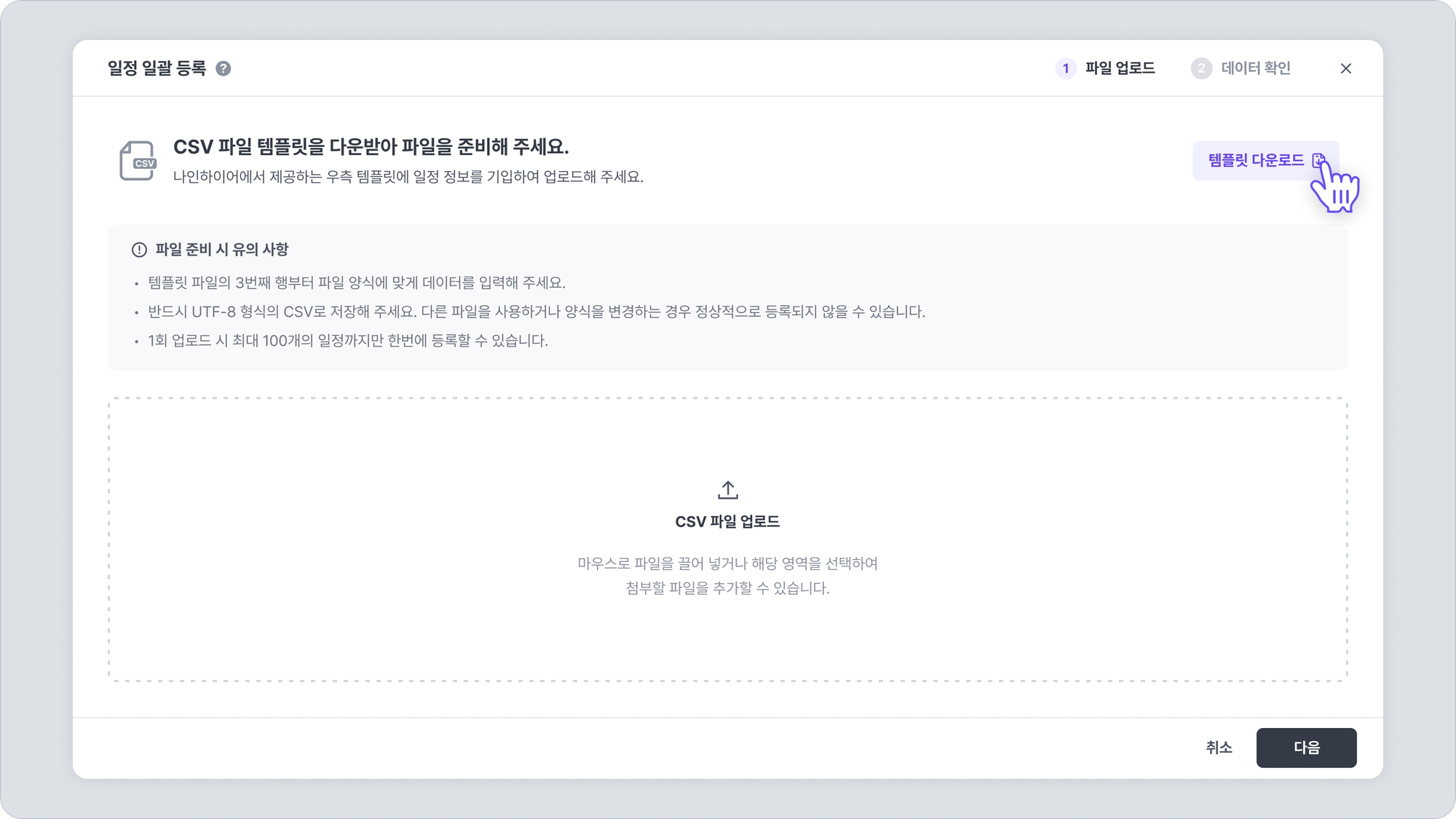 일정 일괄 등록 창이 나타납니다. CSV 파일로 일정 정보를 정리하기 위해 템플릿을 다운로드합니다.