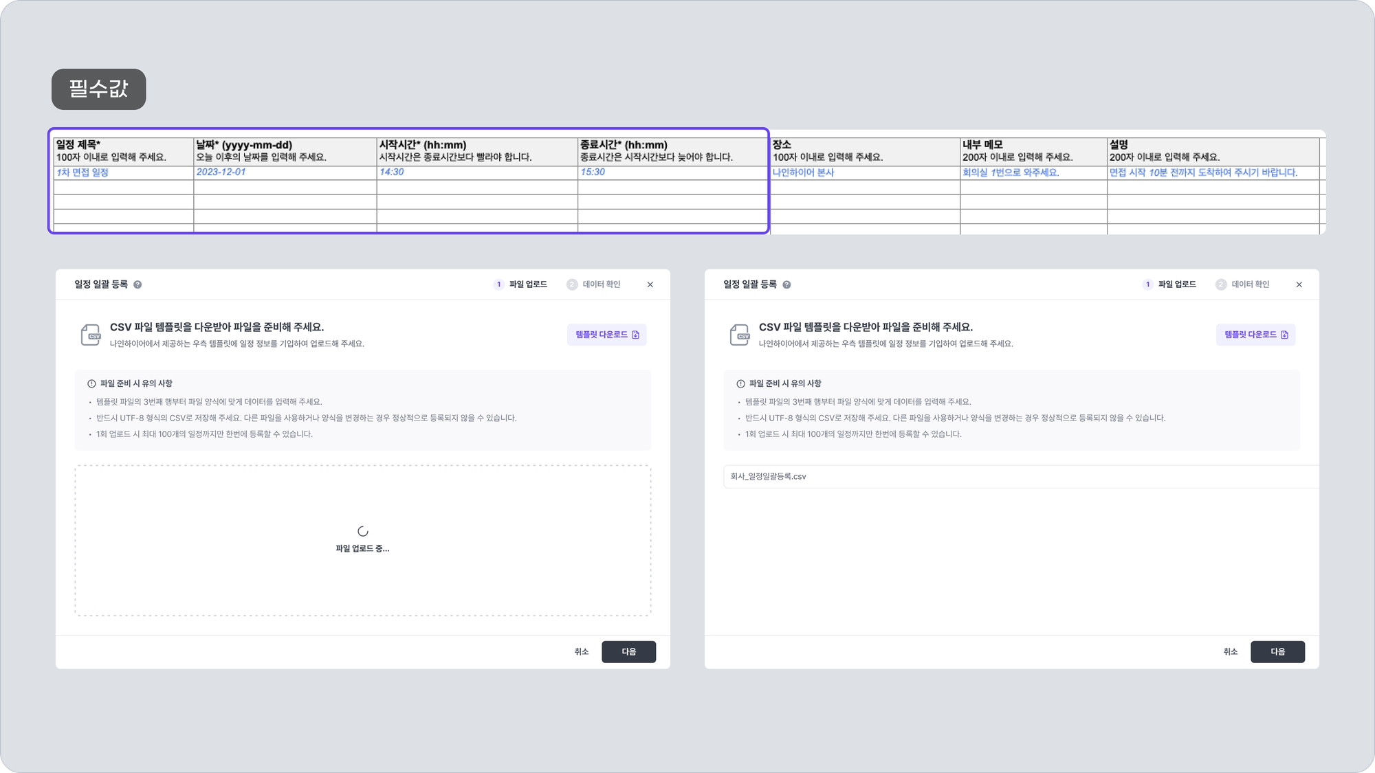 템플릿에 일정 정보 입력을 마치면, csv 파일로 저장한 후 앞서 열려 있던 일정 일괄 등록 창에 파일을 업로드합니다. 업로드가 완료되면 .csv 확장자 파일이 표시됩니다. (우측 이미지 참고)