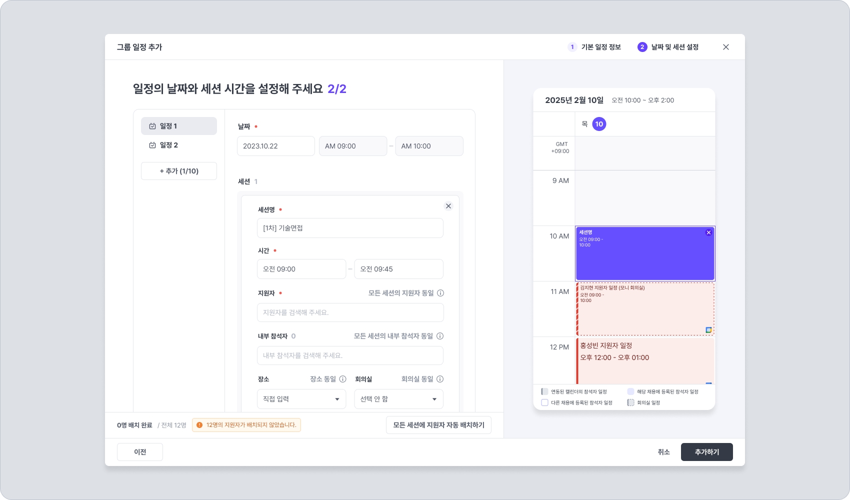 여러 개의 세션을 추가하세요. 모든 세션에 동일한 면접관을 배정하세요. ('모든 세션의 내부 참석자 동일' 버튼을 활용하면 빠르게 면접관을 일괄 배치할 수 있어요)