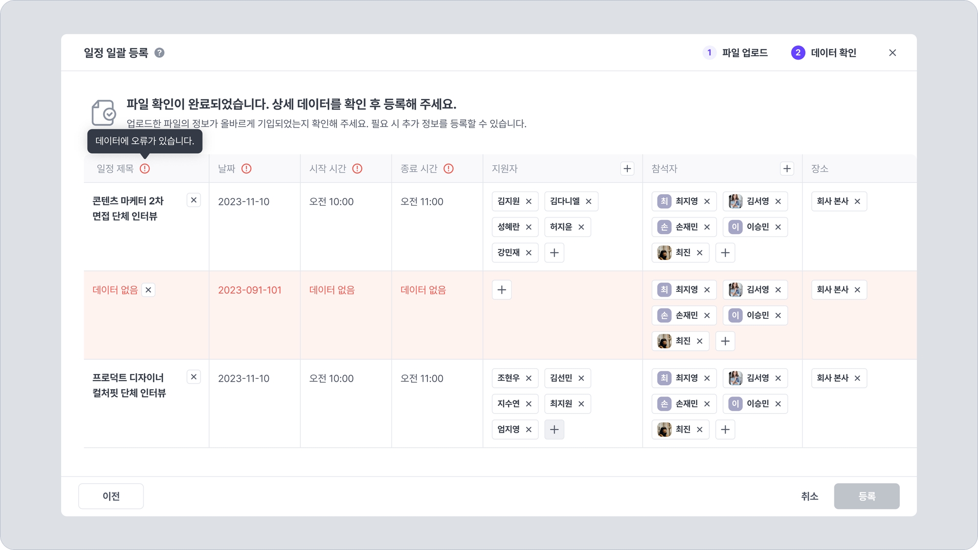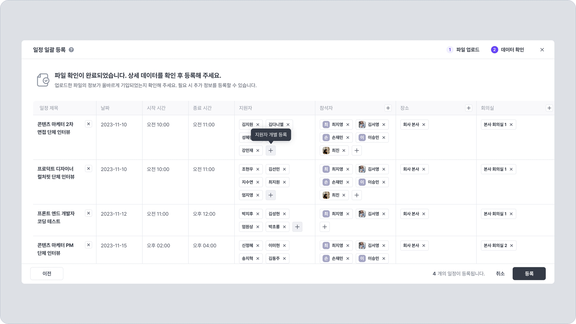 데이터 확인 단계에서는 지원자, 참석자, 회의실 정보를 등록합니다. (장소도 추가/제거 가능) 지원자는 개별 등록이 가능하며 참석자, 장소, 회의실 정보는 일괄 등록과 개별 등록이 모두 가능합니다. 일괄 등록 버튼은 열 제목 오른쪽에 위치하고 있고, 개별 등록 버튼을 각 일정별 셀 안에 위치하고 있습니다.