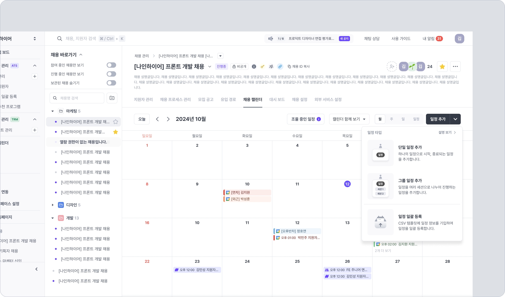 전체 캘린더 / 채용 캘린더 우측 상단에서 [일정 추가] 버튼을 클릭합니다.