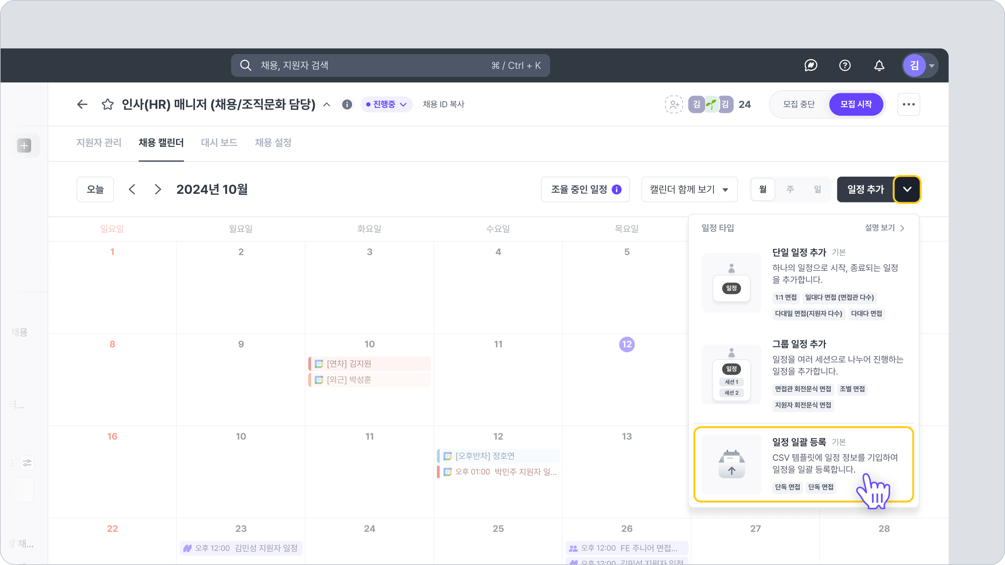 지원자의 면접 일정을 일괄적으로 등록할 수 있습니다.
