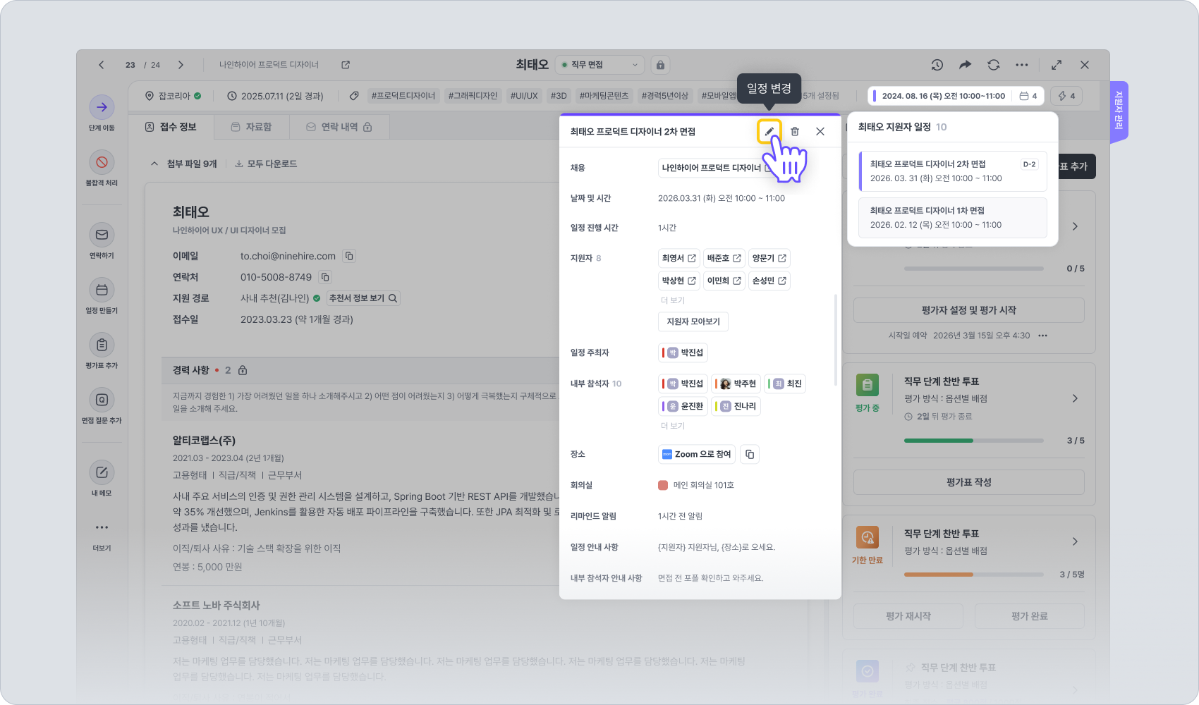 경로 1 : 지원자 상세 화면 우측 상단 일정 선택 > 일정 제목 오른쪽 일정 변경(펜 모양) 버튼 클릭