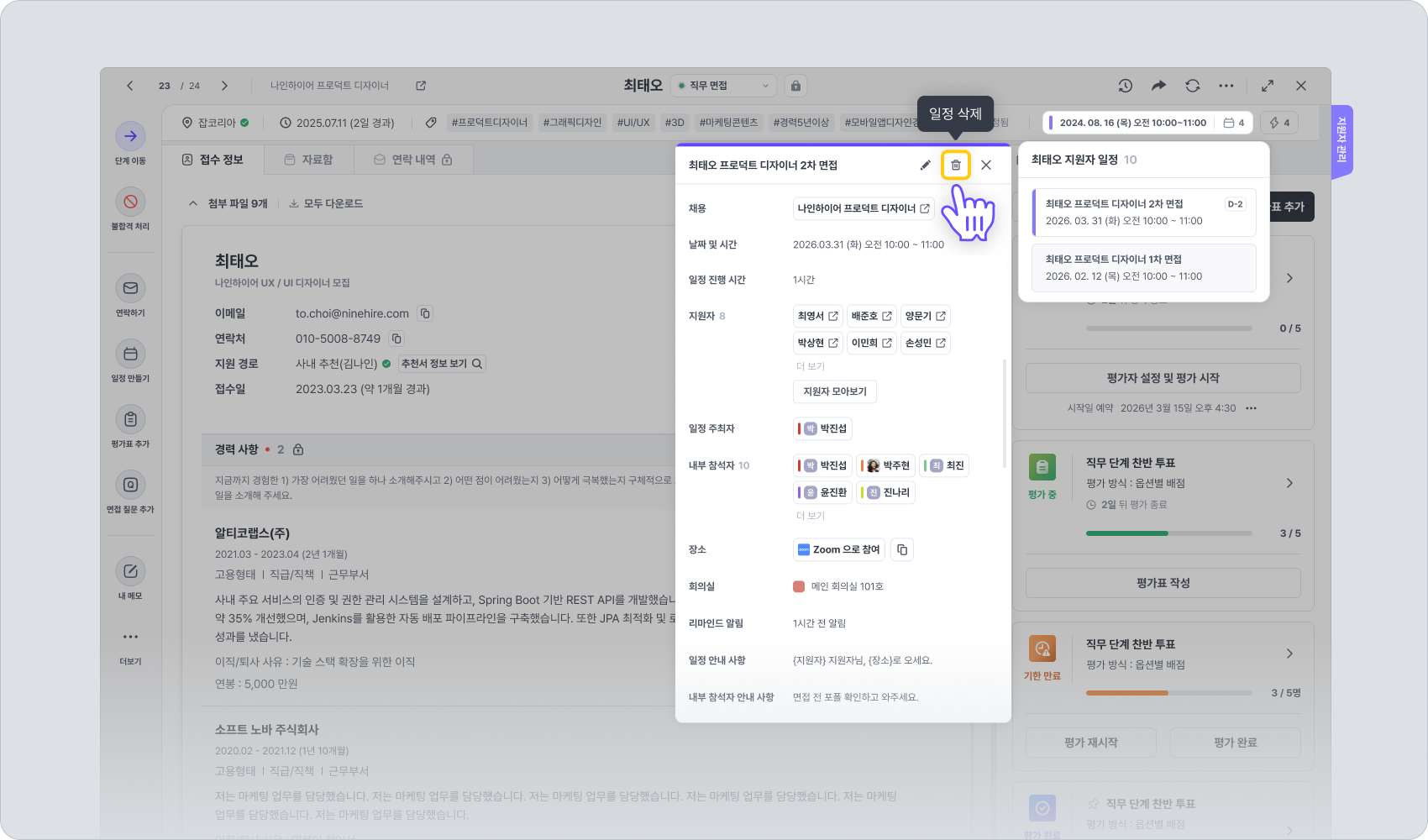 경로 1 : 지원자 상세 화면 우측 상단 일정 선택 > 일정 제목 오른쪽 일정 삭제(휴지통 모양) 버튼 클릭