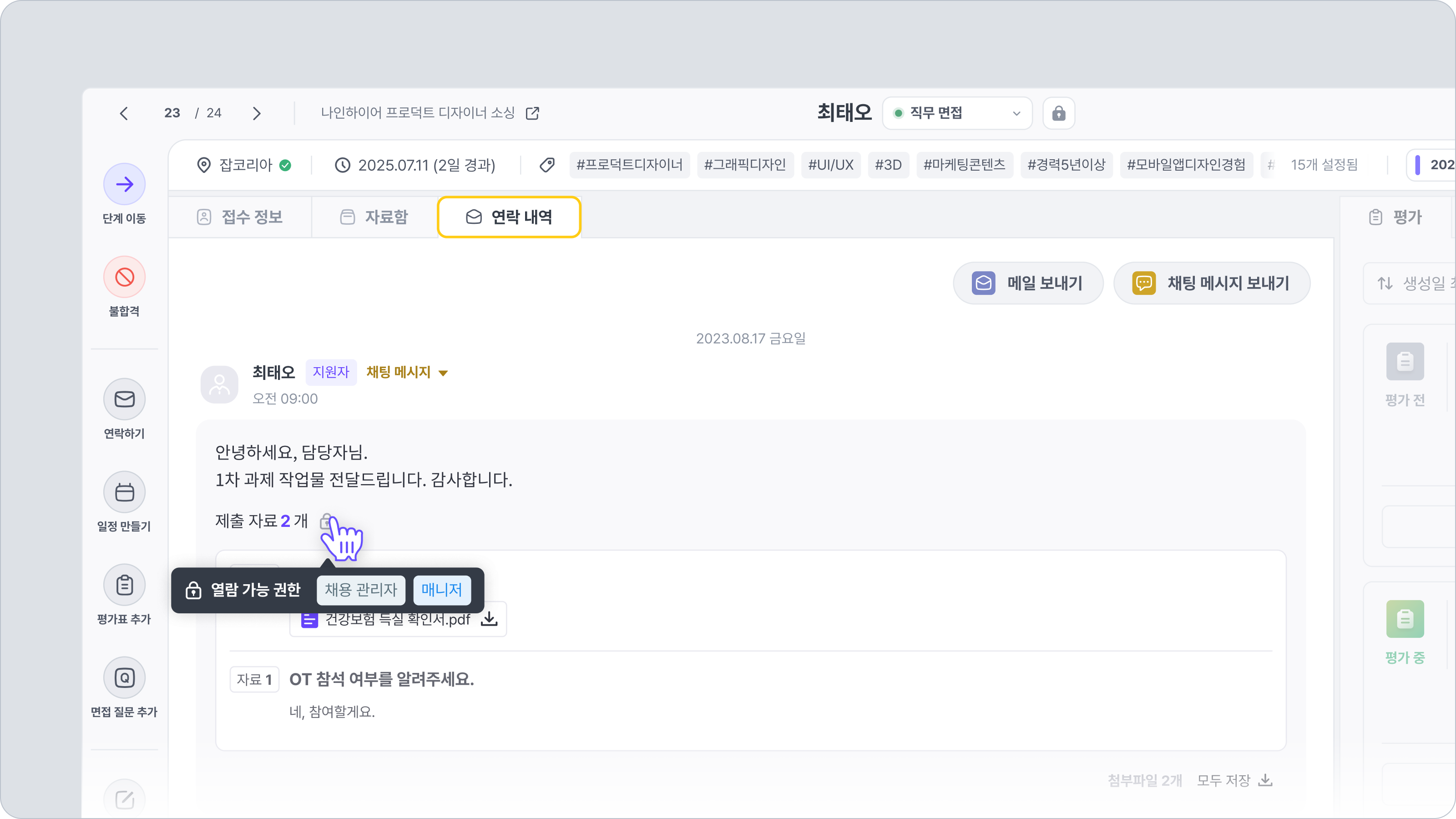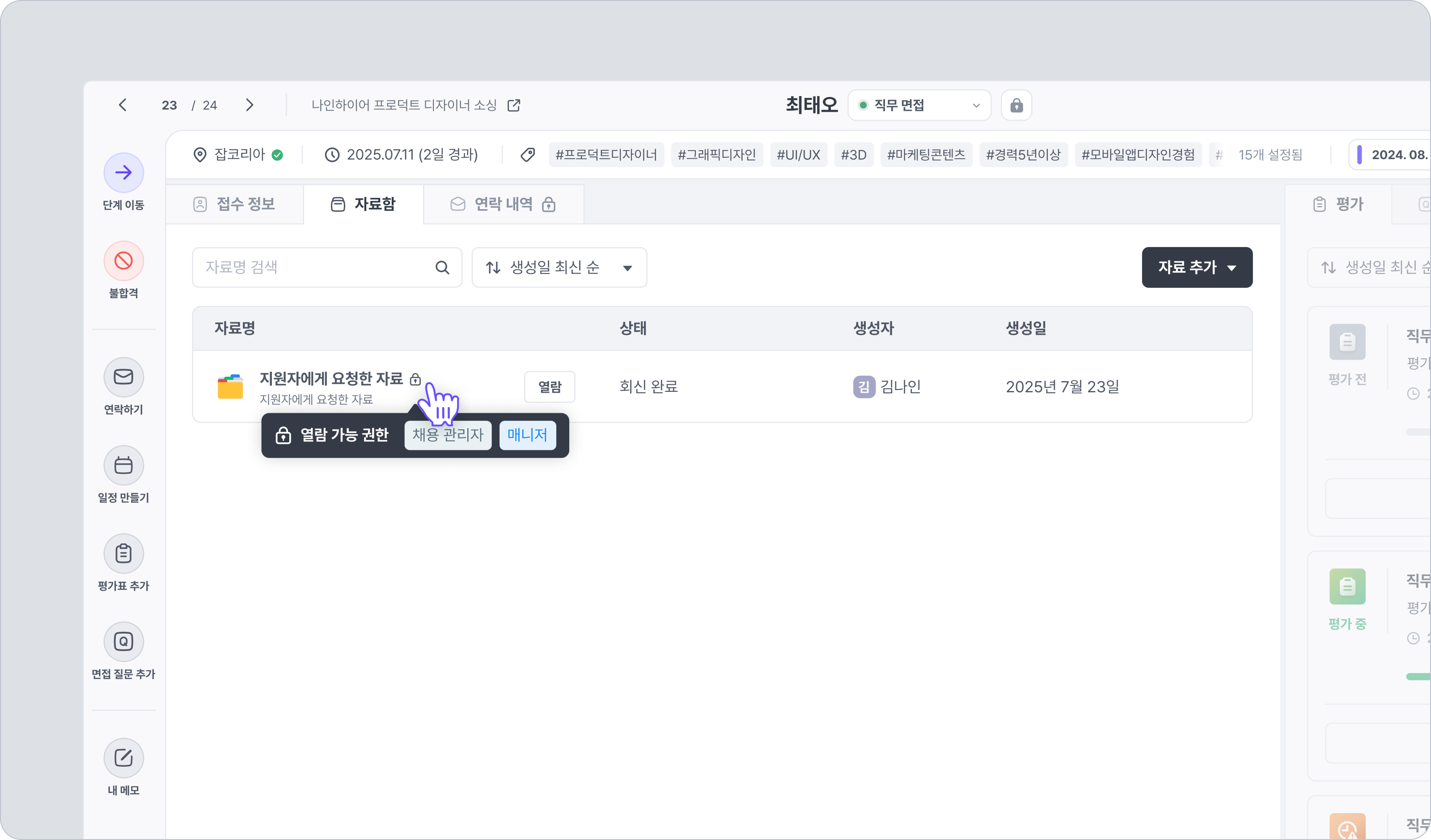 예시 이미지의 경우, 자료 요청 시 매니저 권한으로 열람 권한을 설정하였기에 채용 관리자와 매니저가 열람할 수 있다는 표시가 나타난 것입니다.
