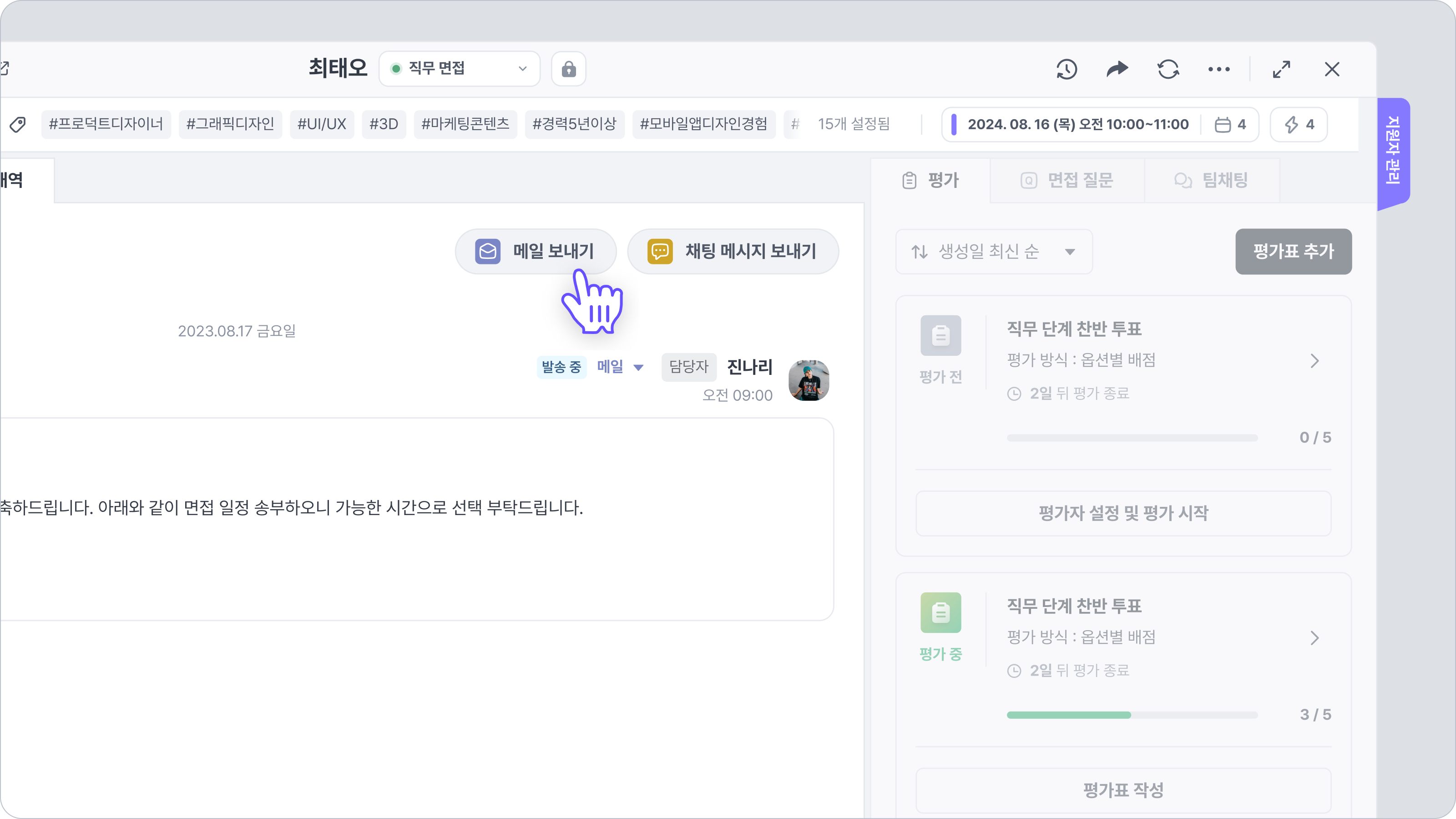지원자 연락 탭 → 메일/메시지 보내기를 클릭하면 나타나는 채팅 메시지/메일 작성 모달에는 자료 요청 기능이 있습니다.