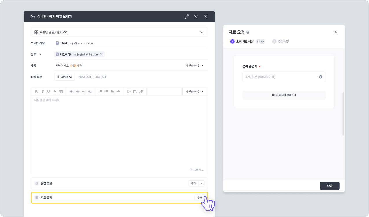 ◼ 경로: 개별 채용 → 지원자 상세 화면 → 지원자 연락 → 메일/메시지 보내기 → 자료 요청