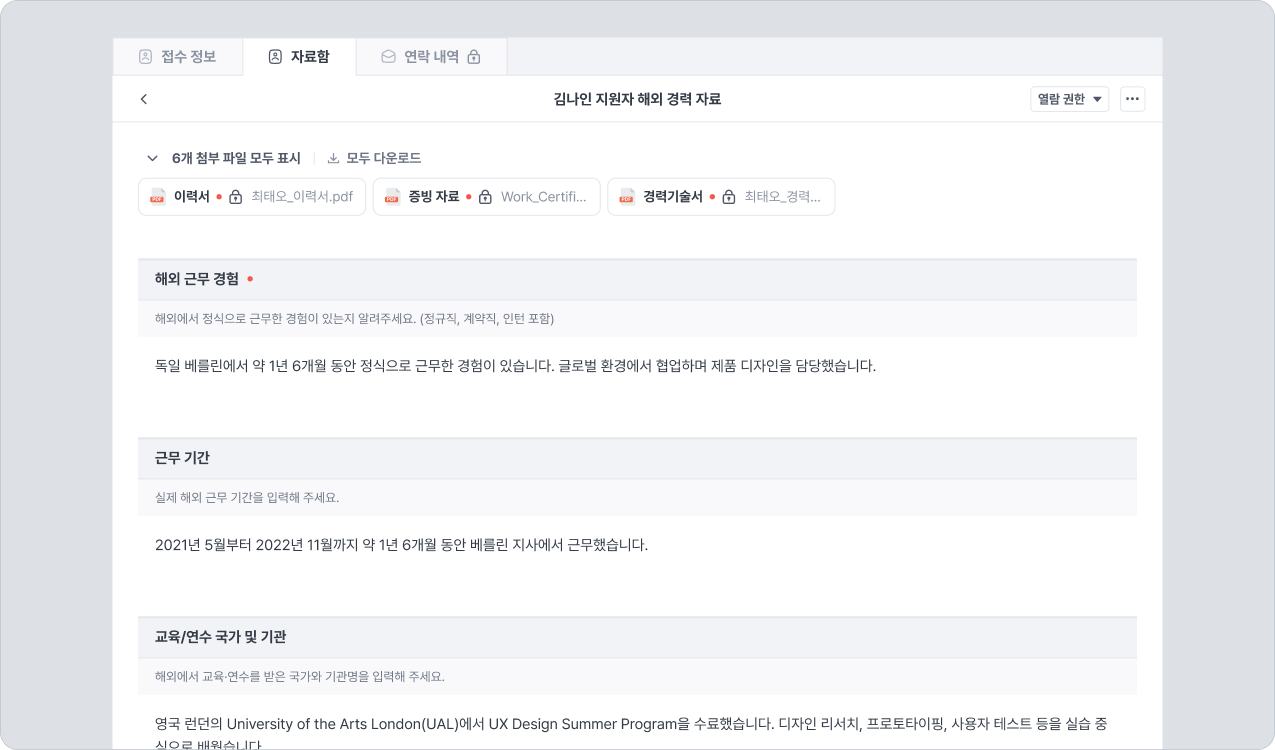 ◼ 경로: 개별 채용 → 지원자 상세 화면 → 자료함 → 요청 자료