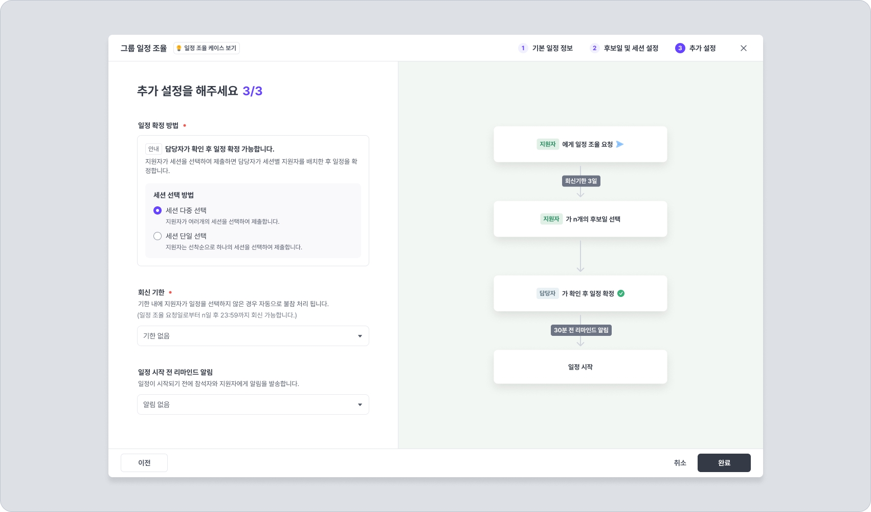 회신 기한 : 일정 선택에 대한 회신 기한을 설정합니다. 만약 회신 기한 내에 일정을 선택하지 않는다면 자동 불참 처리됩니다.